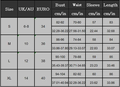 Размер; европейский размер; Размер Великобритании/Австралии; Обхват груди; обхват талии; Длина рукава