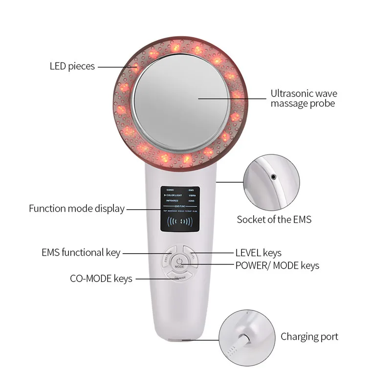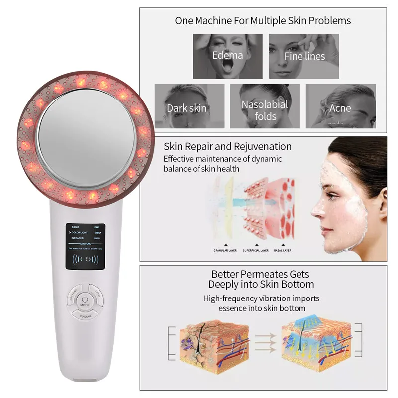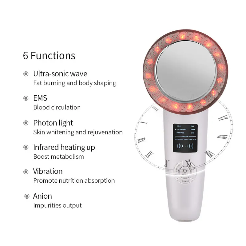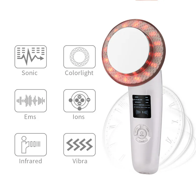 【 6 массажных Modes】EMS, вибрация, звуковой, инфракрасный луч, ионы и 6 красочных огней для массажа лица и тела и эффективного омоложения кожи.