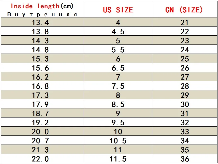 1. Размер США не является стандартным, просто удобно для вас сделать заказ. Пожалуйста, выберите размер в зависимости от внутренней длины. Есть только китайские размеры на обуви. Пожалуйста, обратитесь к китайскому размеру, когда получите товар 2: Мы не вернем вам деньги, если вы выбираете неправильный размер, пожалуйста, выберите размер внимательно. 3: способ выбрать идеальную обувь для ваших детей. Длина ступни + 1 см = Внутренняя длина. Пожалуйста, измерьте длину ступни вашего ребенка, как показано ниже. В том случае, если ее/его, что соответствует длине стопы в 11,5 см; Вы можете добавить сюда свой 1 см. Что сказать, выбирайте внутренняя длина 12,5 см. Спасибо за вашу помощь. 4. Из-за различий в способах измерения возможна погрешность в 1 см, что является нормой.