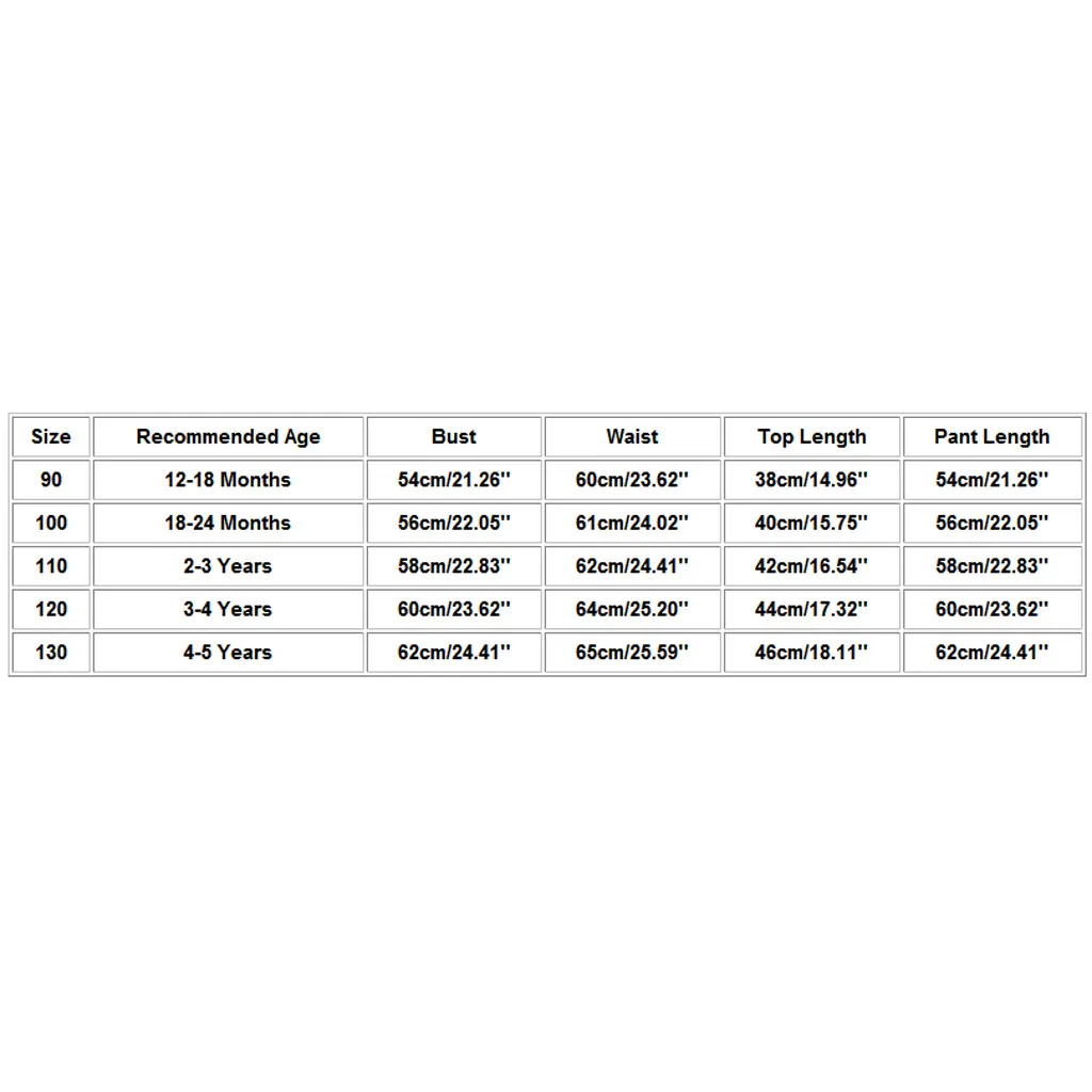 Размеры: 90Рекомендуемый возраст: 12-18 месяцевБюст: 54 см/21,26''Талия: 60 см/23,62''Длина верха: 38 см/14,96''Длина брюк: 54 см/21,26''Размеры: 100Рекомендуемый возраст: 18-24 месяцаБюст: 56 см/22,05''Талия: 61 см/24,02''Длина верха: 40 см/15,75''Длина брюк: 56 см/22,05''Размеры: 110Рекомендуемый возраст: 2-3 годаБюст: 58 см/22,83''Талия: 62 см/24,41''Длина верха: 42 см/16,54''Длина брюк: 58 см/22,83''Размеры: 120Рекомендуемый возраст: 3-4 годаБюст: 60 см/23,62''Талия: 64 см/25,20''Длина верха: 44 см/17,32''Длина брюк: 60 см/23,62''Размеры: 130Рекомендуемый возраст: 4-5 летБюст: 62 см/24,41''Талия: 65 см/25,59''Длина верха: 46 см/18,11''Длина брюк: 62 см/24,41''