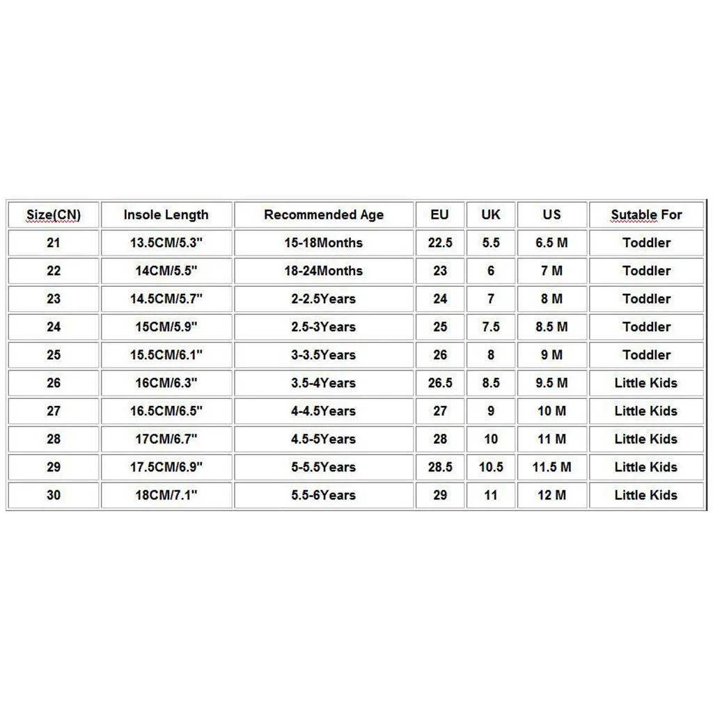 Размеры (CN) Стельки Длина Рекомендуемый возраст ЕС Великобритания Свяжитесь с нами Удобен для 21 13,5 см/5,3" 15-18Months 22,5 5,5 6,5 м Для детей ясельного возраста 22 14 см/5,5" 18-24Months 23 6 7 м Для детей ясельного возраста 23 14,5 см/5,7" 2-2.5Years 24 7 8 м Для детей ясельного возраста 24 15 см/5,9" 2,5, для возраста до 3 лет 25 7,5 8,5 м Для детей ясельного возраста 25 15,5 см/6,1" 3-3.5Years 26 8 От 9 месяцев Для детей ясельного возраста 26 16 см/6,3" 3,5-4 лет 26,5 8,5 9,5 м Дети дошкольного возраста 27 16,5 см/6,5" 4-4.5Years 27 9 10 м Дети дошкольного возраста 28 17 см/6,7" 4,5-5 лет 28 10 11 м Дети дошкольного возраста 29 17,5 см/6,9" 5-5.5Years 28,5 10,5 11,5 М Дети дошкольного возраста 30 18 см/7,1" 5,5-6 лет 29 11 Размеры от 12 мес. Дети дошкольного возраста