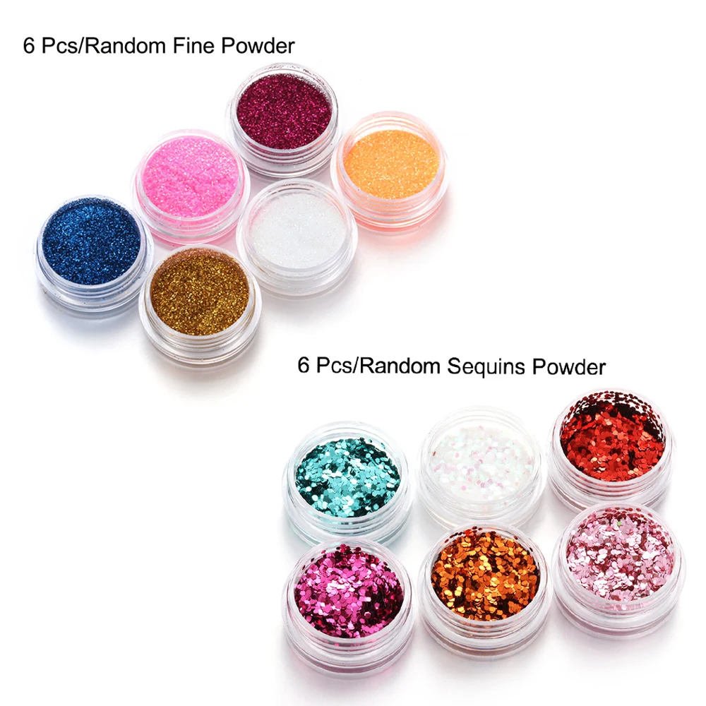 Цвет: случайный Вес: 30 г Отделка: блеск Стили: комплект тонкой пудры, набор пудры с блестками Посылка включает в себя: 6 шт теней для век порошок бутылка/случайный