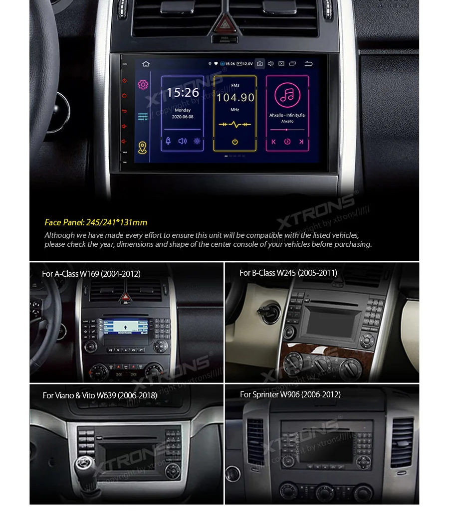 Подходящие моделиДля Mercedes-Benz B-Class W245 (2005-2011), A-Class W169 (2004-2012), Viano & Vito W639 (2006-2018) (Пожалуйста, проверьте размеры заранее), Sprinter W906 (2006-2012)Примечание: у этого устройства нет DVD.Лицевая панель: верх: 245x низ: 241x131ммХотя мы приложили все усилия, чтобы убедиться, что данное устройство будет совместимо с указанными транспортными средствами, пожалуйста, проверьте год, размеры и форму центральной консоли ваших транспортных средств перед покупкой.Важное примечание о совместимости:1. Перед покупкой убедитесь, что центральная консоль вашего автомобиля находится в форме квадрата, или этот блок не может поместиться в ваш автомобиль.2. Если центральная консоль овальной формы, пожалуйста, обратитесь к XTRONS IB80203EL.3. Если он трапециевидной формы, пожалуйста, обратитесь к XTRONS IB80M209L.4. Данное устройство не поддерживает декодирование информации о кондиционировании вашего автомобиля.5. Пожалуйста, проверьте, есть ли у вашего автомобиля система COMAND, если она есть, этот блок не совместим с вашим автомобилем.6. Пожалуйста, обратите внимание, что ваш CD changer не будет работать после установки этого устройства.Кабели, которые могут вам понадобиться:Пожалуйста, проверьте порт радиоантенны вашего автомобиля, вам может потребоваться заказать кабель для установки. (XTRONS ICE/ACS/ISOFZ совместим)