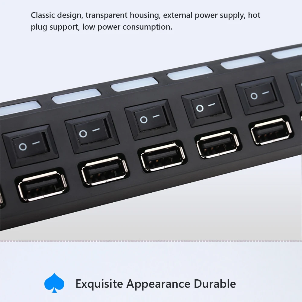 Этот usb-хаб имеет 7 usb-интерфейс, компактный, практичный и удобный. Он может непосредственно подключаться к компьютеру и может быть подключен к внешнему источнику питания для удовлетворения требований высокомощного оборудования, он прост и прост в использовании.