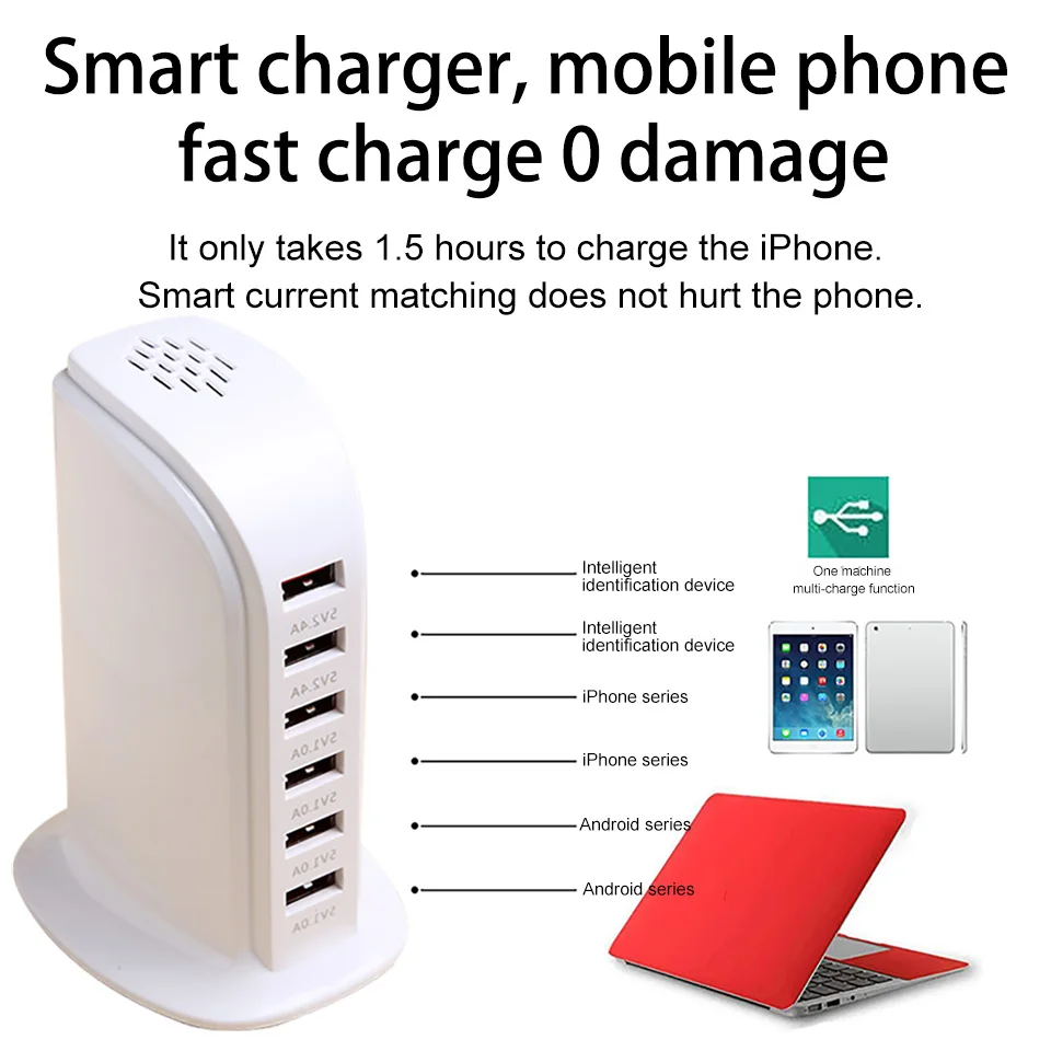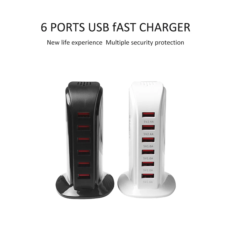 Характеристики многопортовой зарядной станции: 6 DC-5V usb-порта s, максимальный выходной ток для каждого порта составляет 2,4 A. 100% безопасная зарядка: умное зарядное устройство с суперинтеллектуальным микрокомпьютерным чипом. Защищает устройство от перезаряда, перегрева и короткого замыкания, безопасно и надежно. Примечание: Пожалуйста, используйте оригинальный кабель вашего устройства или третий-вечерние сертифицированный кабель, плохое качество USB кабель может привести к короткому замыканию зарядного устройства. Умная док-станция для зарядного устройства: каждый usb-порт интеллектуально идентифицирует ваши устройства и обеспечивает соответствующий ток для этого устройства. Уникальный стильный дизайн: форма башни, портативный размер и экономия пространства. Изготовлен из абс + ПВХ композитного огнезащитного материала, гладкий и прочный. Можно использовать по всему миру: 100V до 240V входное напряжение переменно тока, компактный размер делают его идеально подходит для путешествий. Размер: 3,07*2,56*4,45 дюймов. Идеальный подарок для вашего друга или семьи. Параметры Вход: AC 100-240V 50/60HZ Порты и разъёмы Выходная мощность: 5В/1A ,5V/2.4A Порты и разъёмы в состоянии Размеры: 3,07*2,56*4,45 дюйма (Д * Ш * В) Вес нетто: 254g (включает в себя шнур питания) посылка Вес: 307 г посылка Содержание: 1x usb зарядное устройство 1x источника питания шнур