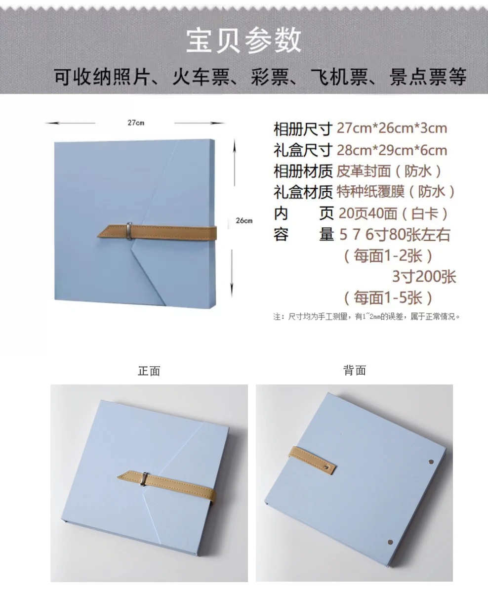 Размер альбома: 27*26*3 см размер подарочной коробки: 28*29 × 6 см Материал альбома: кожаный чехол (водонепроницаемый) материал подарочной коробки: специальная бумажная пленка (водонепроницаемая) Внутренняя страница: 20 страниц, 40 лиц Емкость: 5/7/6 дюйма, Можно поставить около 80 3 дюймов, можно поставить около 200 или около того, разорвать прозрачную пленку, поместить фото билета на поезд, билета на кино, билета на авиакомпанию, туристического билета, напишите слово, чтобы высушить, а затем закройте его обратно на прозрачную пленку. Обратите внимание на сглаживание справа налево