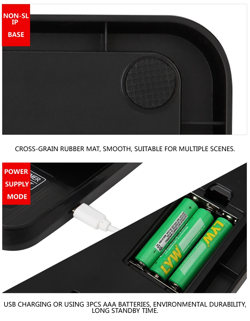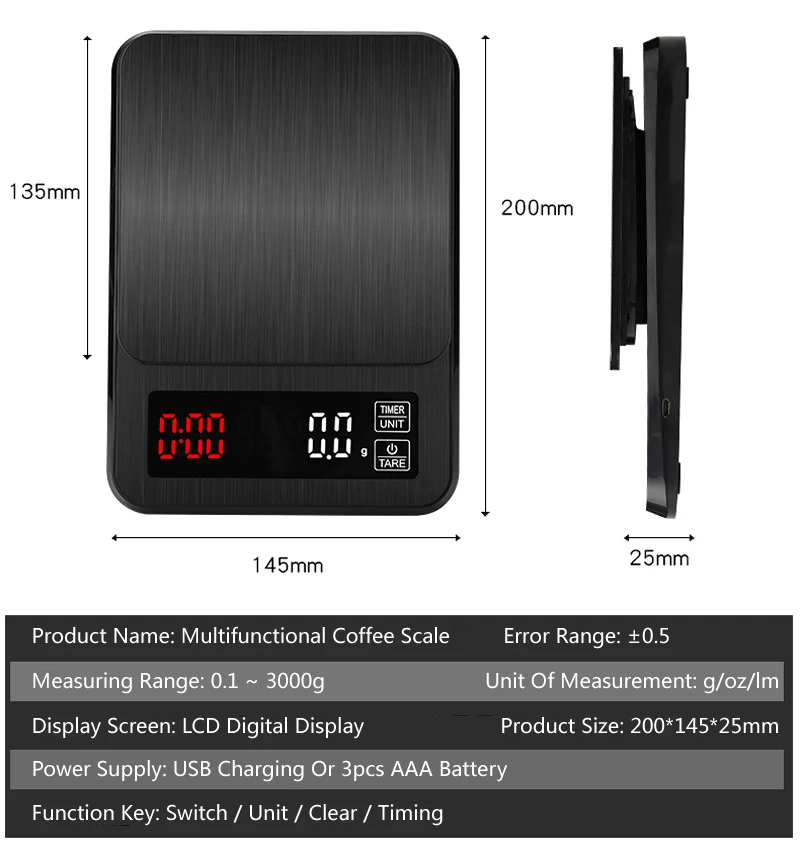 Особенности: 1. Для шкал кофейных шкал, промытых вручную, и шкал кухонных шкал 2. ЖК-дисплей, прозрачные чтения, включая функции синхронизации, напоминание о низком уровне мощности и перегрузку 3. 4 единицы измерения: г, унции, фунт 4. 2 вида функциональной кнопки: вкл/выкл, тары, единицы измерения, запуск/остановка Технические характеристики: Название: бытовые кухонные весы с таймером Материал: пластик Цвет: черный Размер: 192*127*28 мм Режим электропитания: 3 аккумулятора AAA (не входят в комплект) или разъем USB (inlcude) Самое длинное время: 99 минут и 59 секунд (для времени ручной стирки кофе) Ёмкость/точность: 5000g/0,1g/10000g-1g