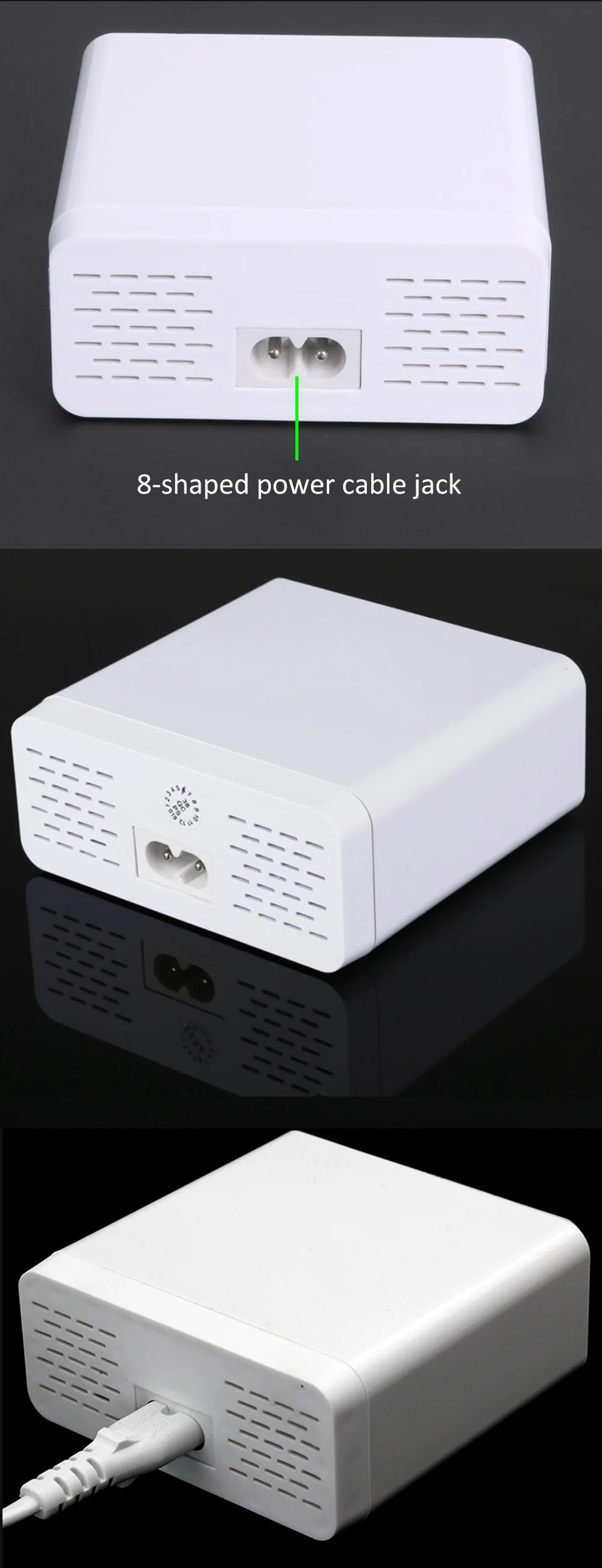 Характеристики: 1. Сильная Совместимость: подходит для зарядки мобильных телефонов, планшетов и других электронных продуктов различных брендов. 2. Быстрая зарядка: 6-порт совокупными характеристиками 6A, с переключением между дальним и порт максимальный расход до 3.5A (в зависимости от того, кабель для передачи данных-к материалу). 3. Удобный и практичный: Просто подключите шнур питания переменного тока, чтобы избежать опасности, вызванной несколькими зарядными устройствами на мобильный телефон, разделяющими одну розетку. 4. Интеллектуальное обнаружение тока зарядки: Интимная защита вашего электронного оборудования, значительно повышает безопасность продукта и увеличивает срок службы. 5. Светодиодный дисплей: светодиодный экран может отображать данные о токе и напряжении. Характеристики: Тип вилки: штепсельная вилка стандарта США, штепсельная вилка европейского стандарта, штепсельная вилка стандарта Великобритании (опционально) Материал: АБС-пластик Цвет: белый Входное напряжение: 110-240 В Входной ток: 0,3a (макс.) Выход ток: 5V / 6A Размеры: 88*86*38 мм/3,5*3,3 * 1.4in Вес: прибл. Посылка 289g: 1 Зарядная Станция USB 1 шнур питания