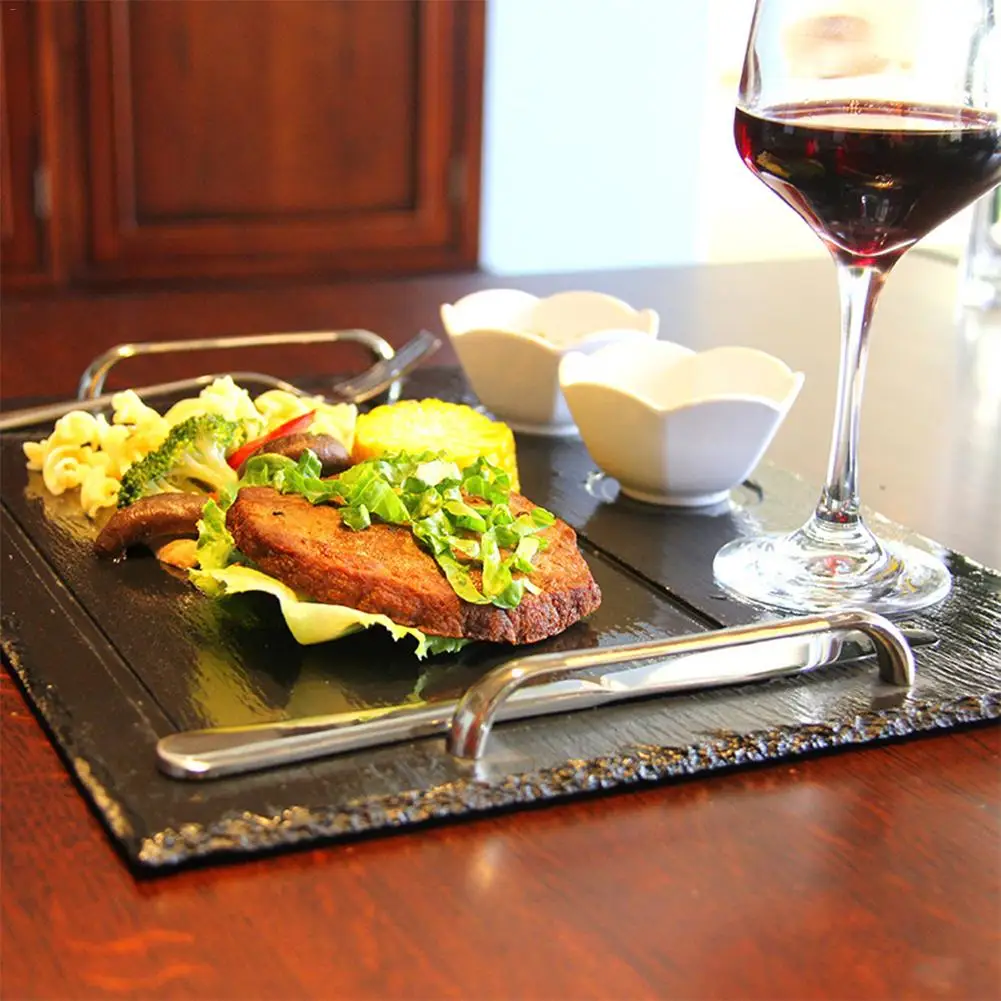 1. Широкое хранение: хорошая тарелка с хорошим лотком, который является элегантным и шикарным. Лоток принимает литье из цинкового сплава, специально разработано три подстаканника для соус для стейка, хранения вина и салата.1 * шиферная доска для выпечки
