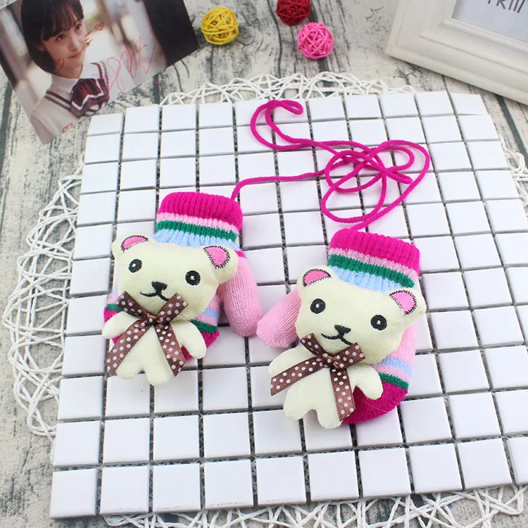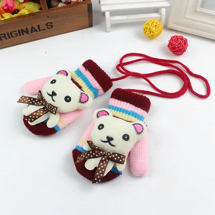 Осенне-зимние детские перчатки, От 1 до 3 лет, утепленные варежки для мальчиков и девочек, вязаные перчатки с рисунком медведя и веревкой, Детские митенки для пальцев