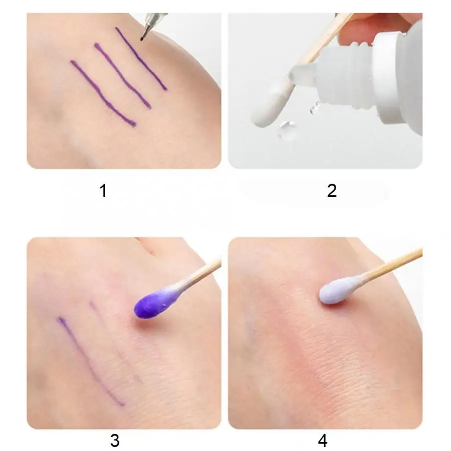 Можно легко стереть следы татуировки, оставить чистую и гладкую кожу. Изготовлен из безопасногоТип, Которая безвредна для вашей кожи. Быстрый эффект. Помогает сэкономить время и силы татуировщика. Прозрачная жидкая текстура, легко наносится. Очень подходит для тату отличного мастера, новичка в макияже, косметического специалиста и т. Д.