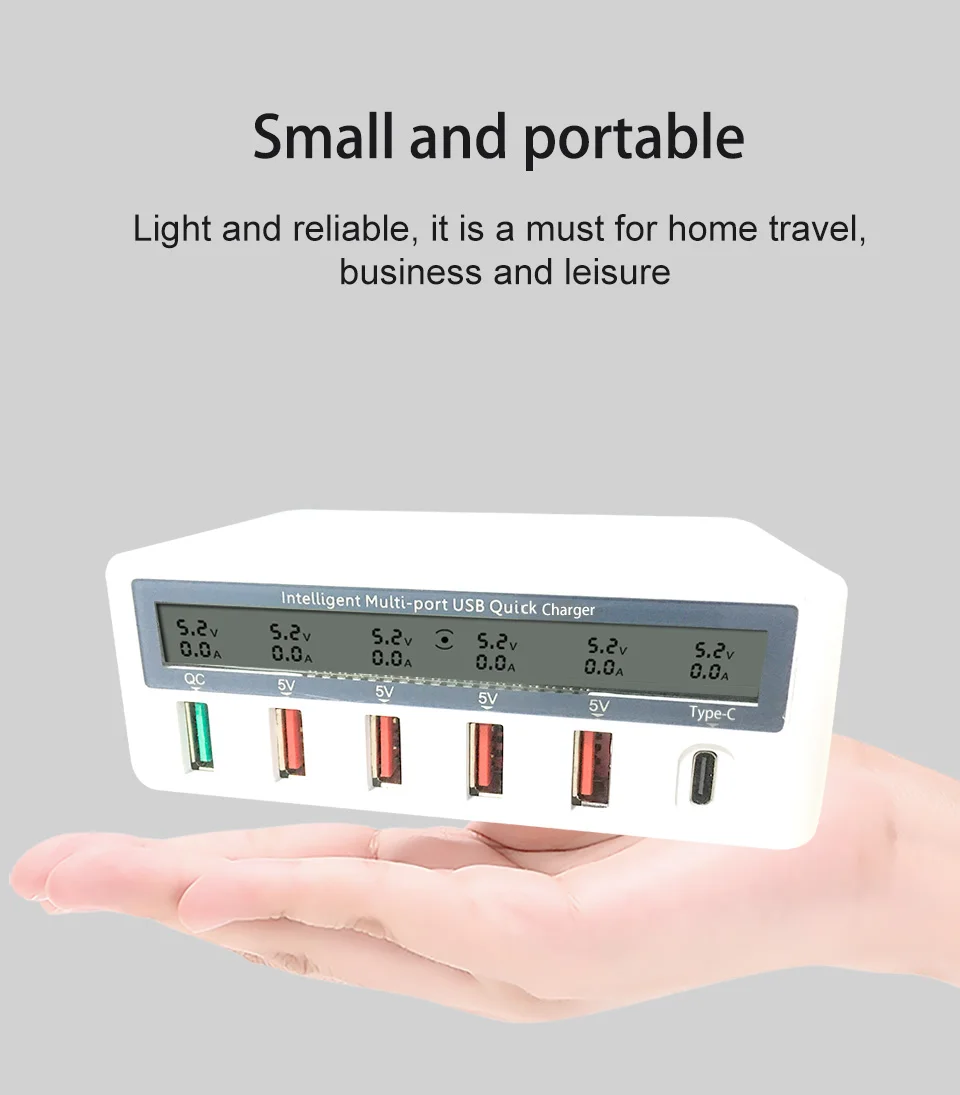 Уникальный светодиодный дисплей Светодиодный дисплей поможет вам контролировать ток зарядки и состояние батареи в режиме реального времени Компактный и портативный дизайн Складная конструкция для зарядки, чтобы сэкономить место, когда не используется, и легкий, легко носить с собой, идеально подходит для дома, офиса, путешествий и других помещений. Входное напряжение: AC100 ~ 240V 50/60Hz Общая мощность: 5 В/20 А Выход QC3.0: 5 В/3A 9 В/2A 12 В/1.5A Выход типа C: 5 В/3 А Один выход USB: 5 В/2,4 А (макс.) Вес: 240 г Размер: 115x80x42 мм Цвет: белый Стандарт штепсельной вилки: штепсельная вилка стандарта США Материал: АБС-пластик + Поликарбонат Содержимое упаковки: 1 х Смарт USB быстрое зарядное устройство 1x штепсельная вилка американского стандарта шнур