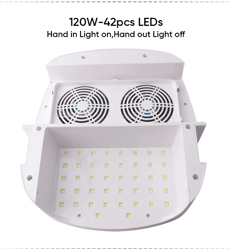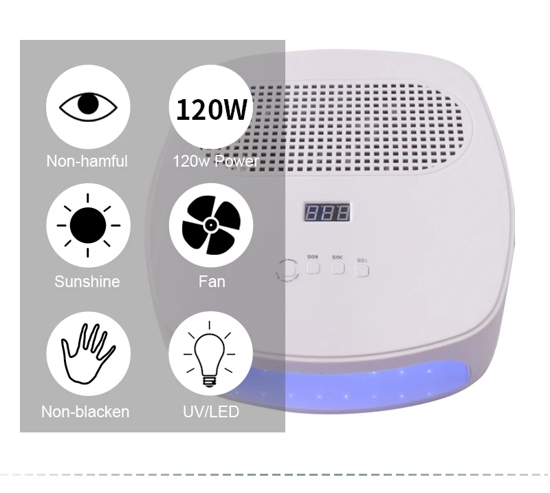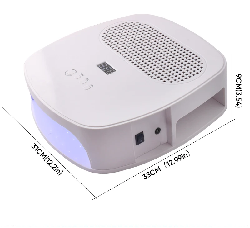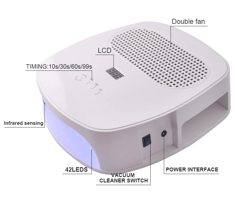 Макс Мощность: 84 Вт. Размеры: 30*10*30 см. Светодиодный: 42 шт УФ/светодиодный beadscolor: белый. Вес: 1400gmultiple синхронизации: 10s/30s/60s/99s. ЖК-дисплей цифровой экран. Может быть помещен в обе руки. В то же время, он имеет ногтевая машина функции и пылесос функции.