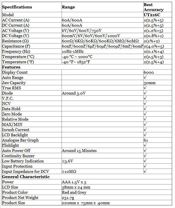 Цифровые зажимные счетчики серии UT216 предназначены для измерения высокочастотных токов (до 400 Гц) на железных дорогах и в аэрокосмической отрасли, серверных комнатах, ИТ-системах и т. Д. Его конструкция с двойным впрыском дает пользователям более удобное сцепление и повышенную долговечность. UT216's 6000 граф дисплей также обеспечивает более точные показания для пользователей. Особенности: 1. Цифровой мультиметр, измеряющий истинные 2. Автоматический диапазон, 3 раза/с частота дискретизации 3. Макс/мин/относительные режимы 4. Датчик температуры k-типа 5. Фонарик 6. Измерение 400 Гц 7. NCV, Бесконтактное тестирование напряжения переменного тока 8. VFC, фильтр низких частот 9. Обнуления функция 10. Пусковой ток 11. Аналоговую столбчатую диаграмму
