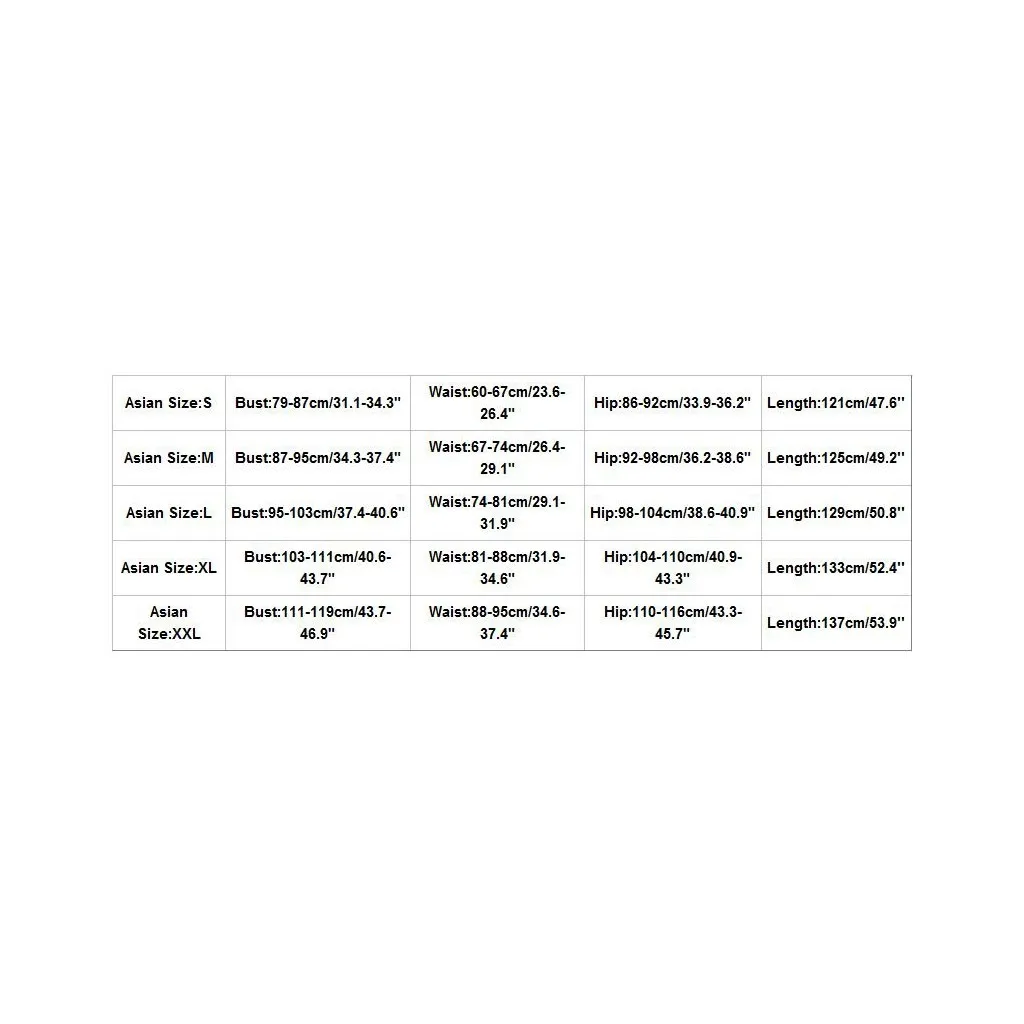 Азиатский размер Бюст Талия Бедра Длина S 79-87 см/31,1-34,3" 60-67 см/23,6-26,4" 86-92 см/33,9-36,2" 121 см/47,6'' М 87-95 см/34,3-37,4" 67-74 см/26,4-29,1" 92-98 см/36,2-38,6" 125 см/49,2'' L 95-103 см/37,4-40,6" 74-81 см/29,1-31,9" 98-104 см/38,6-40,9" 129 см/50,8'' XL 103-111 см/40,6-43,7" 81-88 см/31,9-34,6" 104-110 см/40,9-43,3" 133 см/52,4'' XXL 111-119 см/43,7-46,9" 88-95 см/34,6-37,4" 110-116 см/43,3-45,7" 137 см/53,9''