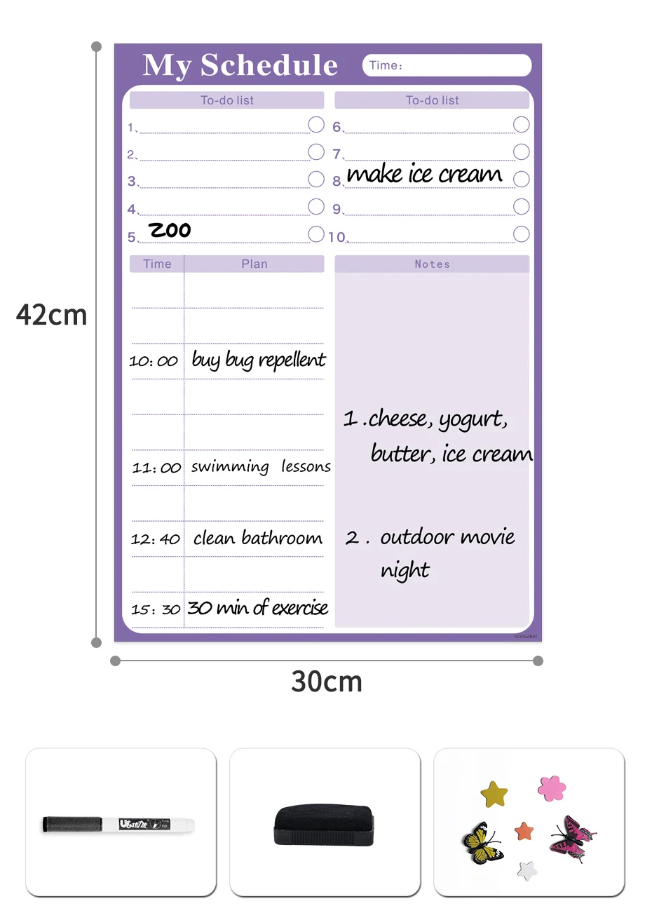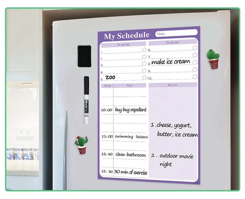 Описание: детские chore chart, магнитное расписание, to-do list Материал: магнитный порошок, резина, HD печать, ПЭТ пленка. Особенности: самомагнитный, гибкий, поддержка письма, портативный, прочный. Размер: 42*30 см Толщина: 0,4 мм Стираемость: сухая стирается, долговечная яркая и легко очищается. Применение: нанесите на поверхность из железа, например, на холодильник и так далее.