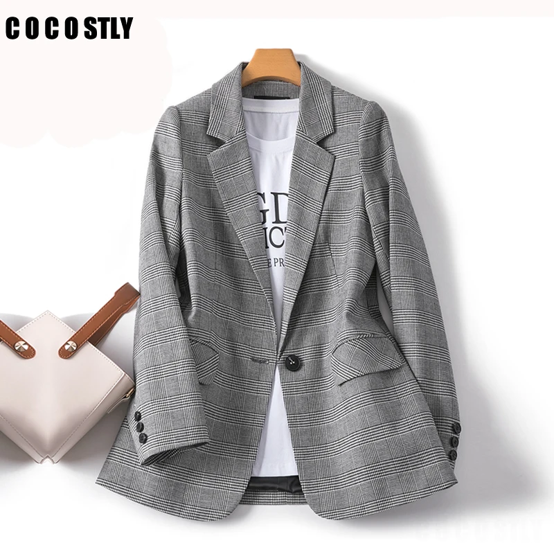 Женский повседневный жакет, Серый жакет с отложным воротником, модельный блейзер для офиса, осень клетчатая одежда