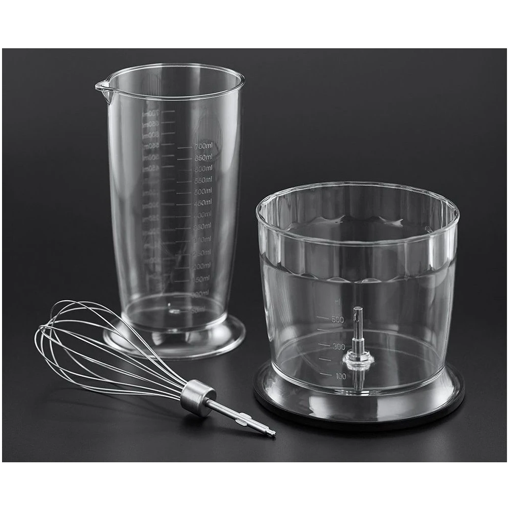 Мощность 500W 2 скорости Съемная погружная часть и ножи из нержавеющей сталиВ комплекте: мерный стакан емкостью 0.5 л, измельчитель емкостью 0.5 л. с ножами из нержавеющей стали, венчик из нержавеющей стали