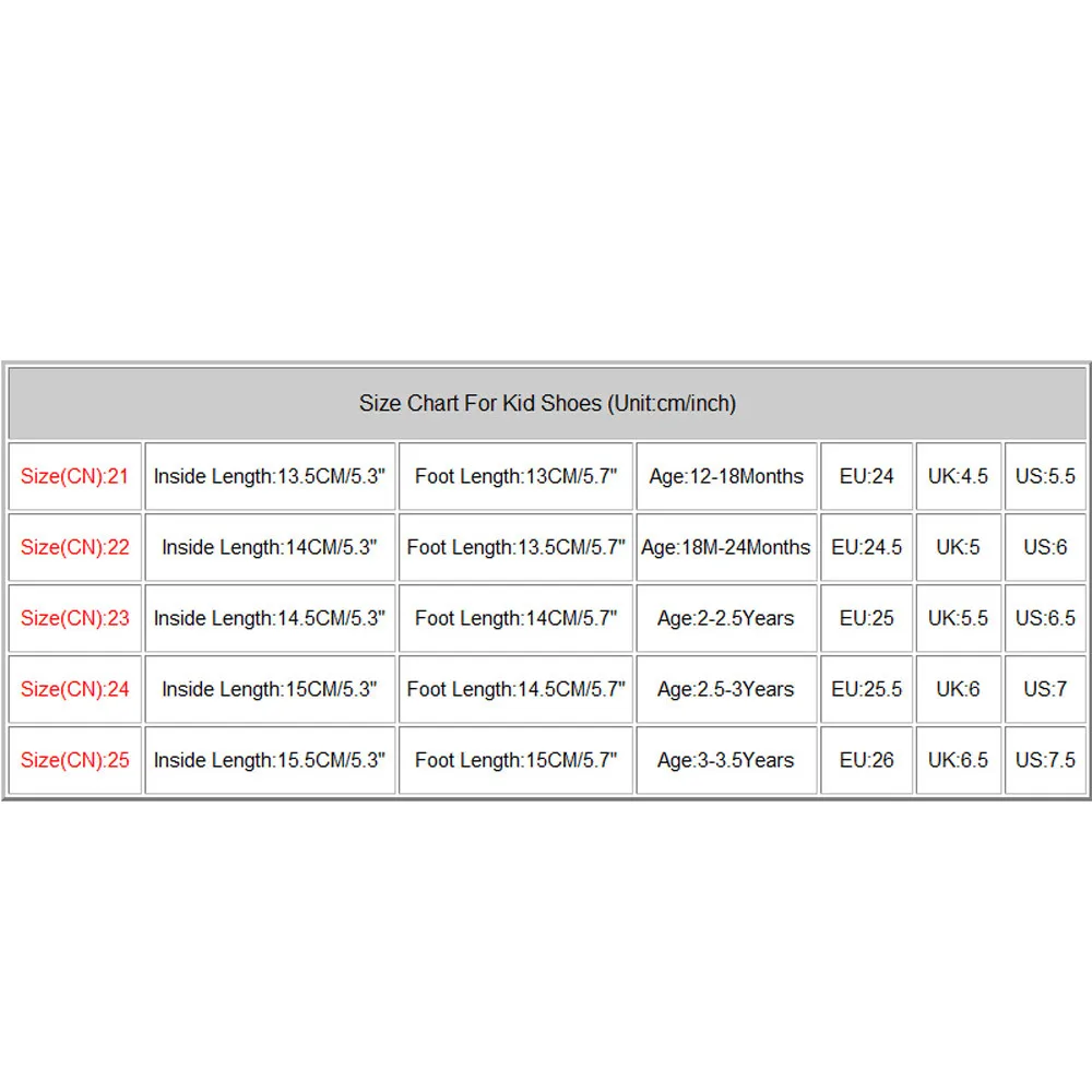 Таблица размеров для детской обуви (Единица измерения: см/дюйм) Размер (CN): 21 Внутри Длина: 13,5 см/5,3 дюйма Стопа Длина: 13 см/5,7 дюйма Возраст: 12-18Месяцев ЕС: 24 Великобритания: 4,5 США: 5,5 Размер (CN): 22 Внутри Длина: 14 см/5,3 дюйма Стопа Длина: 13,5 см/5,7 дюйма Возраст: 18 М-24Месяцев ЕС: 24,5 Великобритания: 5 США: 6 Размер (CN): 23 Внутри Длина: 14,5 см/5,3 дюйма Стопа Длина: 14 см/5,7 дюйма Возраст: 2-2-5 лет ЕС: 25 Великобритания: 5,5 США: 6,5 Размер (CN): 24 Внутри Длина: 15 см/5,3 дюйма Стопа Длина: 14,5 см/5,7 дюйма Возраст:2,5-3Лет ЕС: 25,5 Великобритания: 6 США: 7 Размер (CN): 25 Внутри Длина: 15,5 см/5,3 дюйма Стопа Длина: 15 см/5,7 дюйма Возраст:3-3,5Лет ЕС: 26 Великобритания: 6,5 США: 7,5