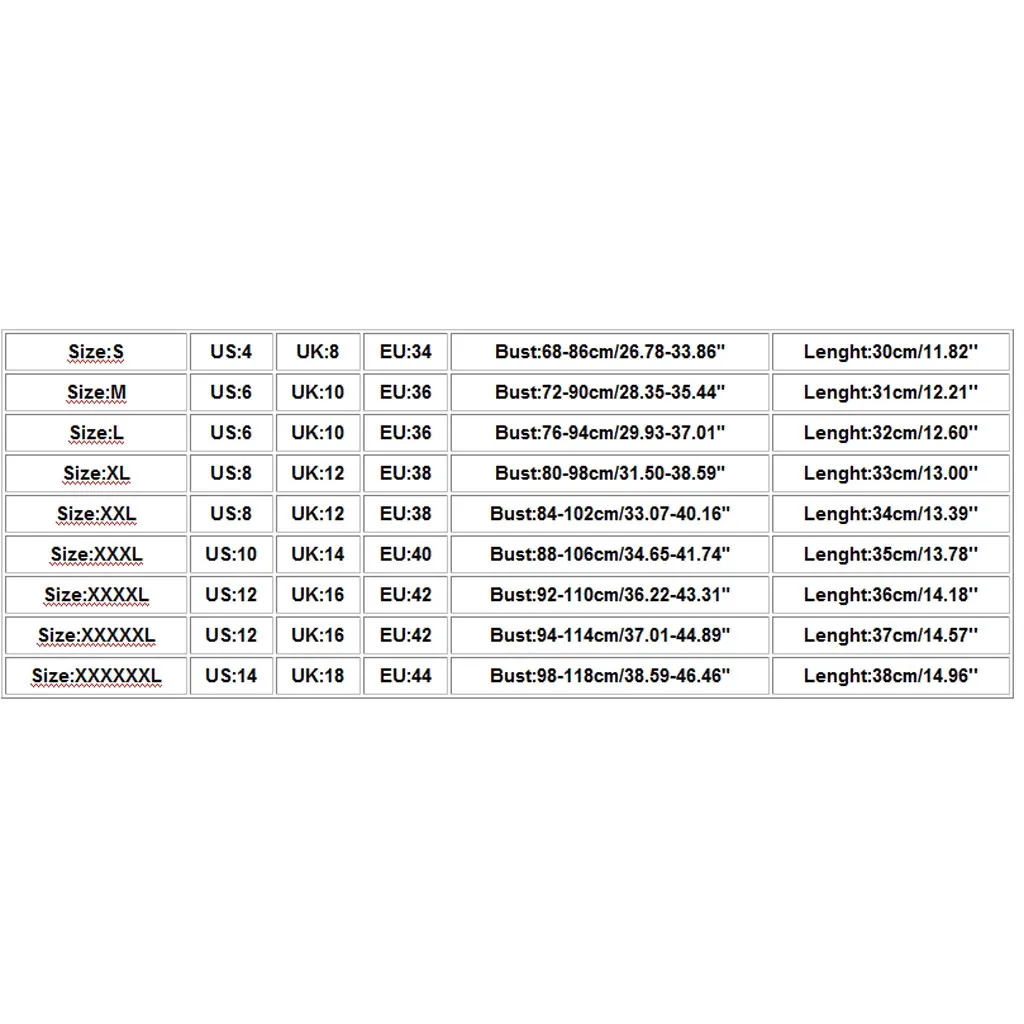 Размеры США Великобритания ЕС Бюст Длина S 4. 8 34 68-86 см/26,78-33,86" 30 см/11,82'' М 6 10 36 72-90 см/28,35-35,44" 31 см/12,21'' L 6 10 36 76-94 см/29,93-37,01" 32 см/12,60'' XL 8 12 38 80-98 см/31,50-38,59" 33 см/13,00'' XXL 8 12 38 84-102 см/33,07-40,16" 34 см/13,39'' XХХL 10 14 40 88-106 см/34,65-41,74" 35 см/13,78'' XXXXL 12 16 42 92-110 см/36,22-43,31" 36 см/14,18'' XXXXXL 12 16 42 94-114 см/37,01-44,89" 37 см/14,57'' XXXXXXL 14 18 44 98-118 см/38,59-46,46" 38 см/14,96''