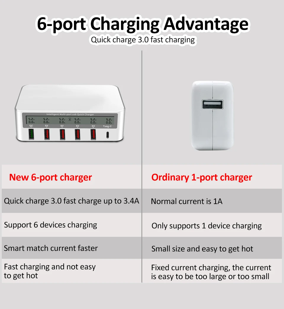 QC USB зарядное устройство Type-C порт с Умной зарядкой многопортовое зарядное устройство для путешествий ЖК-дисплей цифровой дисплей станция мульти-порт USB зарядка штепсельная вилка США