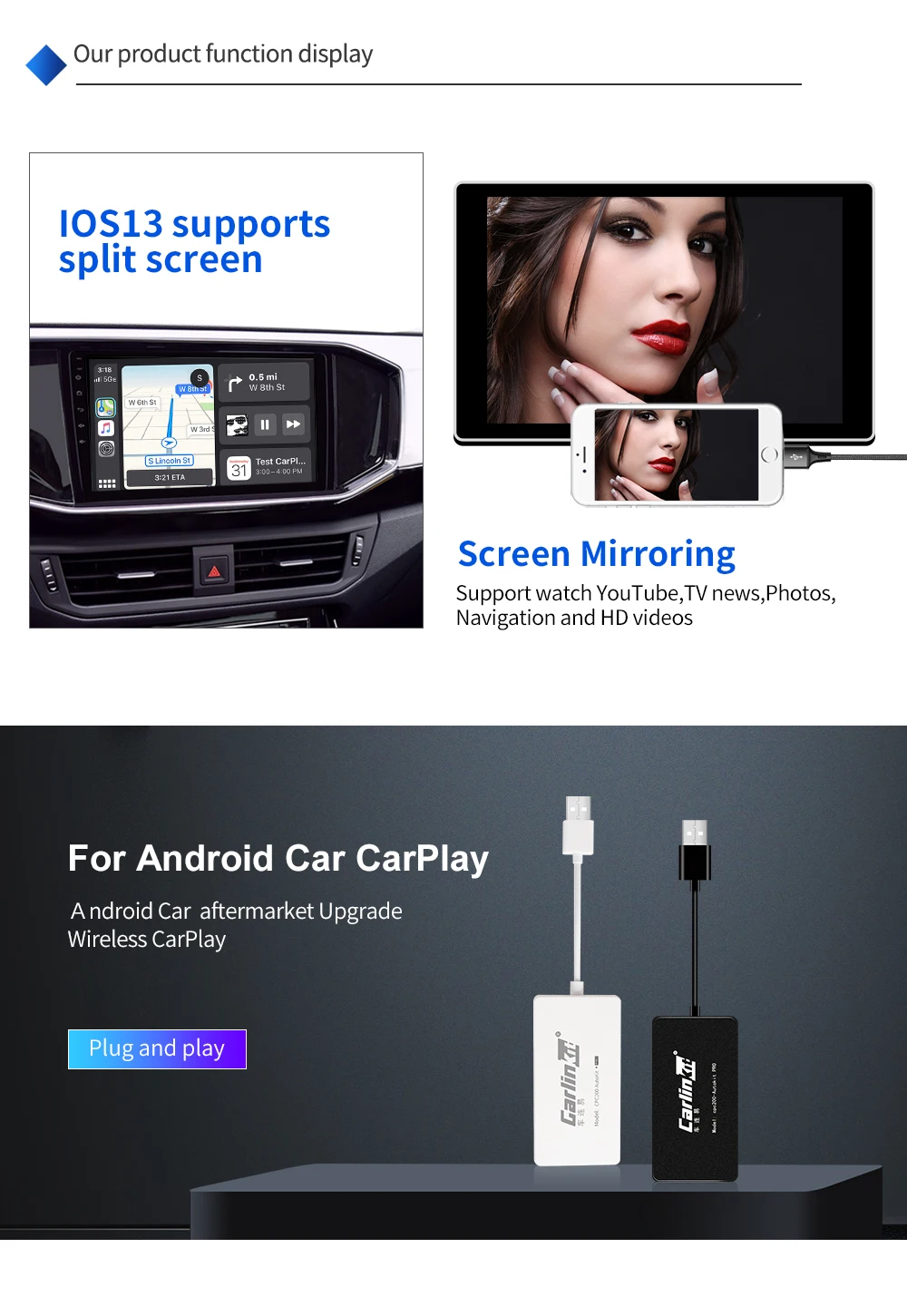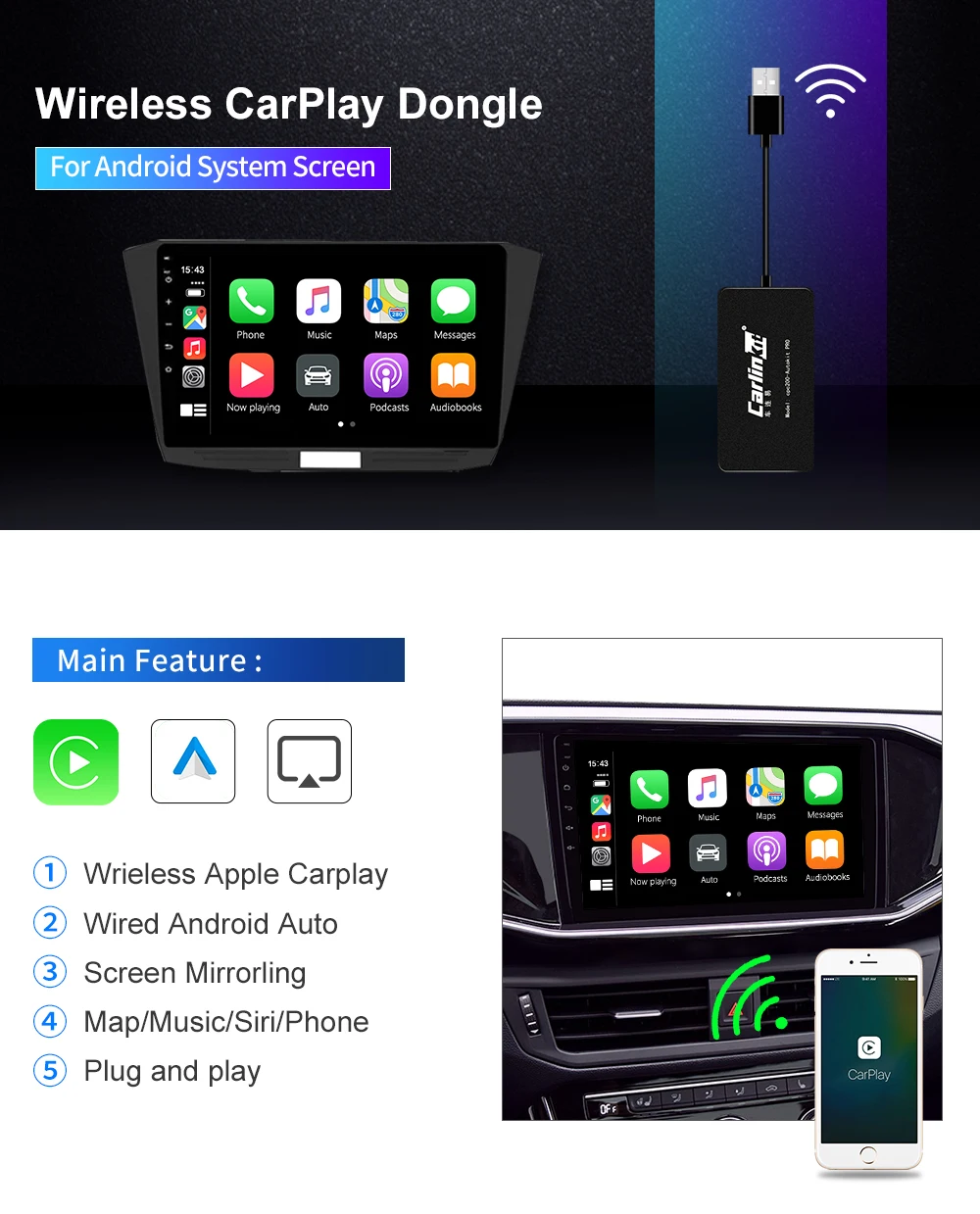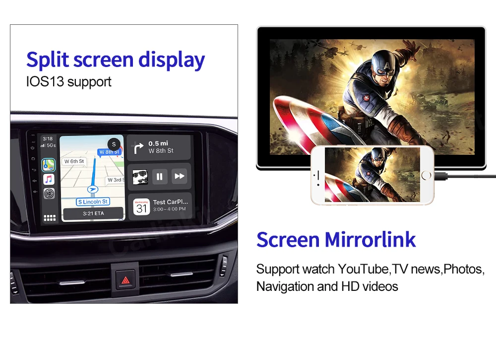 1. Голосовое управление: Поддержка Siri/музыка/карты/телефонные звонки/сообщения/аудио книги. Функция Siri поможет вам позвонить Розе или любому из ваших друзей. Пожалуйста, обратите внимание, что скорость работы нашего устройства зависит от скорости вашего телефона на ios. 2. Сенсорный экран и hd-дисплей: Направленное управление и просмотр телефона на автомобильном навигационном экране с помощью usb-кабеля. 3. Свободные руки и безопасное вождение: Совершайте/отвечайте на звонки, проверяйте голосовые сообщения, текстовые сообщения и создавайте карты. Слушайте ваши любимые песни с помощью приложений в формате «hands free», «Apple Music» или «hands free». 4. Совместимые устройства: IPhone с iOS (7,1 и выше) Мобильные телефоны Android (5 .1 и выше) Автомобильные стереосистемы с android версии (4.4.2 и выше) (Продукт поддерживает большинство телефонов на рынке Android, но это не 100% поддержка всех Android телефонов и Android Авторадио)