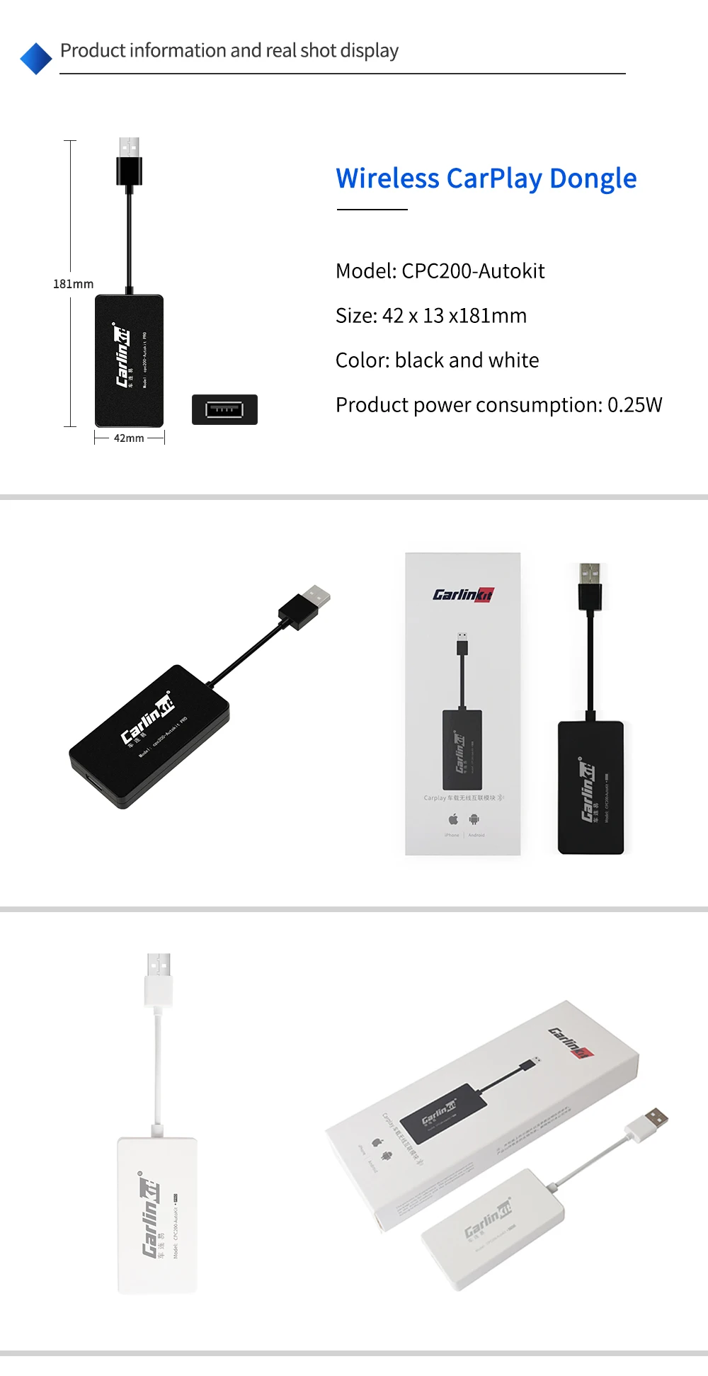 Carlinkit беспроводной смарт-ссылка Apple CarPlay ключ для Android навигационного плеера Mini USB Carplay палка с Android Авто белый