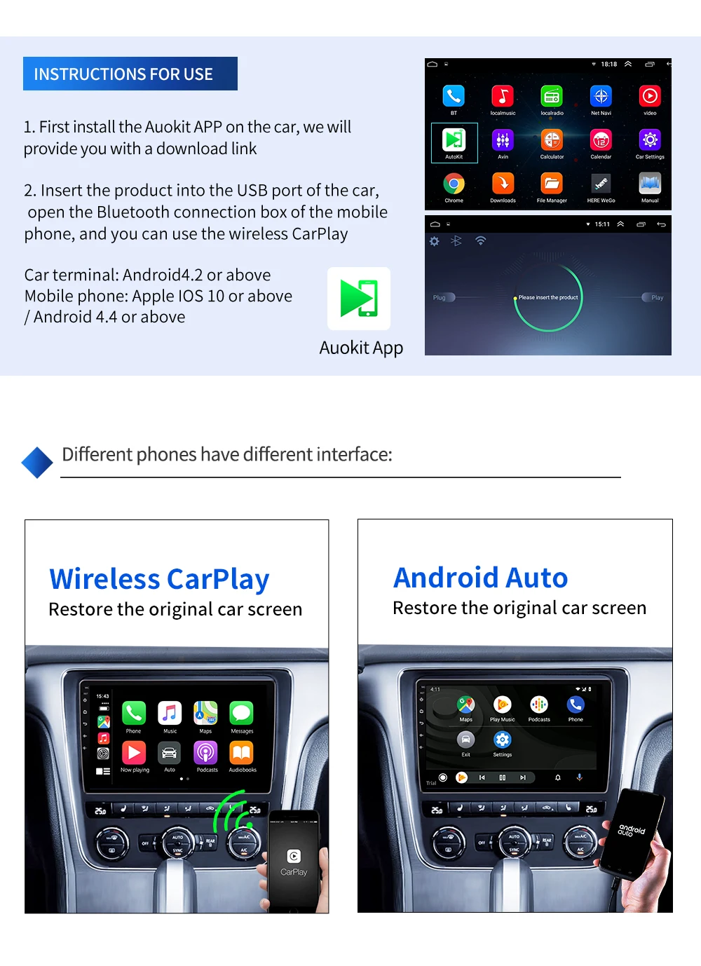 1. Оригинальный экран автомобиля не поддерживается, этот продукт работает только с экраном системы Android. 2. Установите APK перед покупкой; Чтобы узнать, удалось ли установить. Http:/121.40.123.198:8080/AutoKit/AutoKit.apk Продукт поддерживает обновление прошивки, один год гарантии
