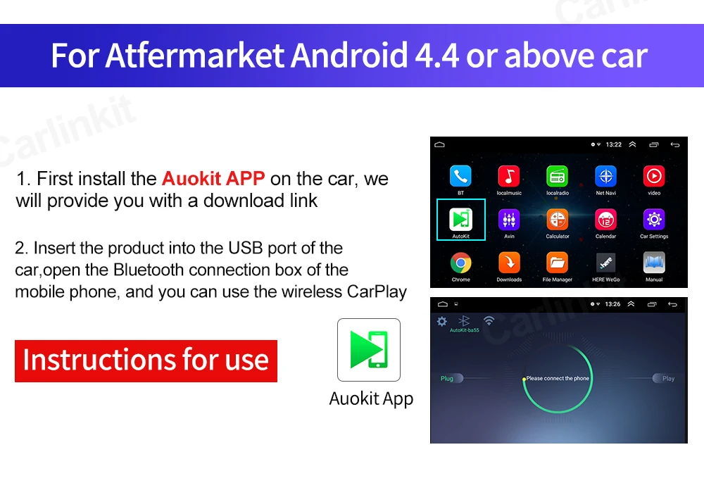 1. Установите Apk для продукта в головном устройстве вашего автомобиля Android. Http:/121.40.123.198:8080/autokit/autokit.apk 2. Подключите продукт к usb-порту Автомобильного головного устройства Android. 3. Сопряжение и подключение bluetooth iPhone с автомобильным bluetooth (iPhone также поддерживает usb-кабель); Телефон Android по-прежнему должен подключаться через usb-кабель. 4. Экран автомобиля войдет в интерфейс CarPlay.