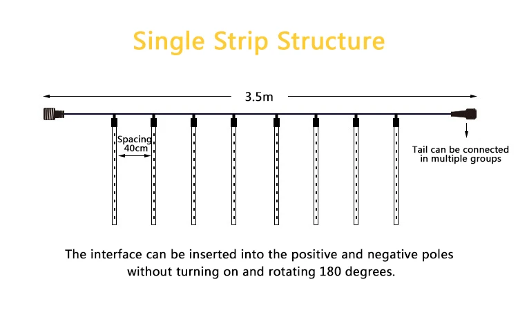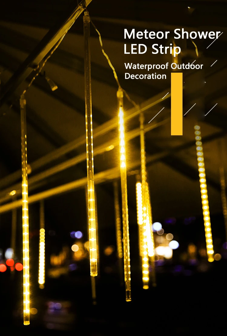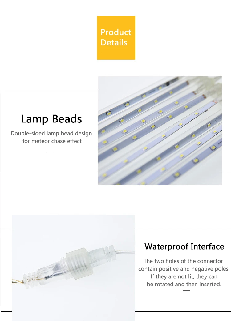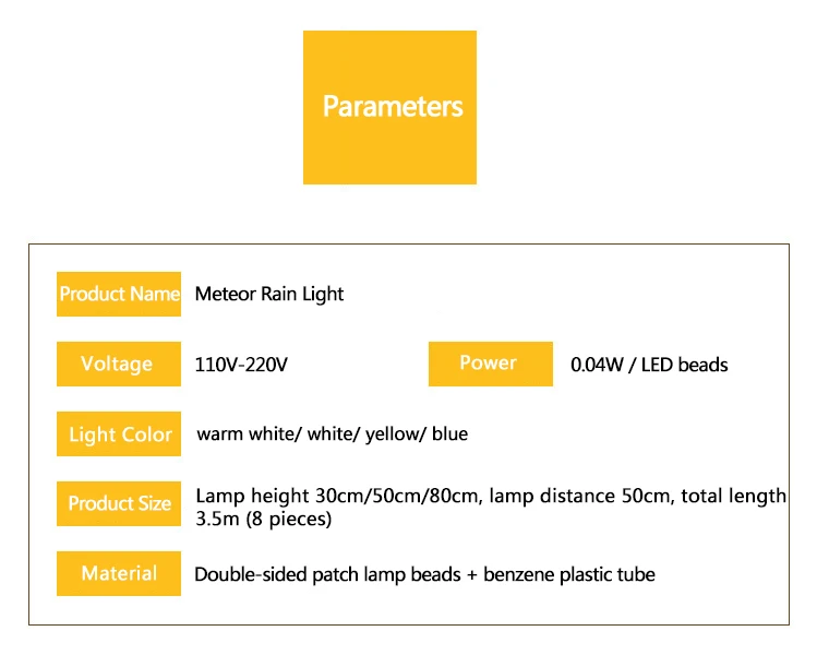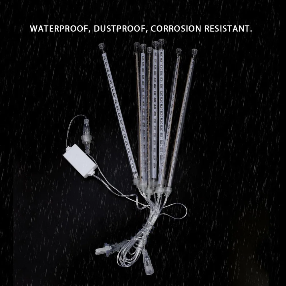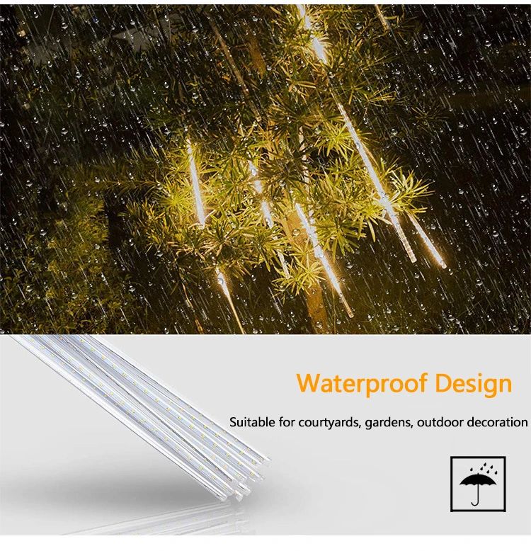 Параметры: 1. Светодиодный Цвет света: мультихлор RGB/синий/теплый белый/белый 2. Кол-во труб: 8 шт. 3. Длина трубки: 30 см/50 см 4. Диаметр трубки. : 1 см 5. Тип штекера: штепсельная вилка европейского стандарта/штепсельная вилка США 6. Рабочее напряжение: штепсельная вилка ЕС: 220 В; штепсельная вилка США: 110 В 7. Хвостовая вилка: Да (с разъемом, поддержка многих струн соединяются вместе) Особенности: 1. Метеоритный эффект, Романтический, эстетический 2. Свет каждой лампы включается и выключается один за другим в порядке и быстро, как метеоритный дождь или падающий снег в ночное небо 3. Применение: рыночное инженерное освещение, архитектурное оформление, оформление деревьев по улочкам, паркам, декорирование, декоративная речка, городское ночное освещение 5. Водонепроницаемый, пылезащитный, устойчивый к коррозии 6. Низкое энергопотребление, энергосбережение Посылка Содержание: 1 х светодиодный Метеоритный Душ дождь трубки комплект
