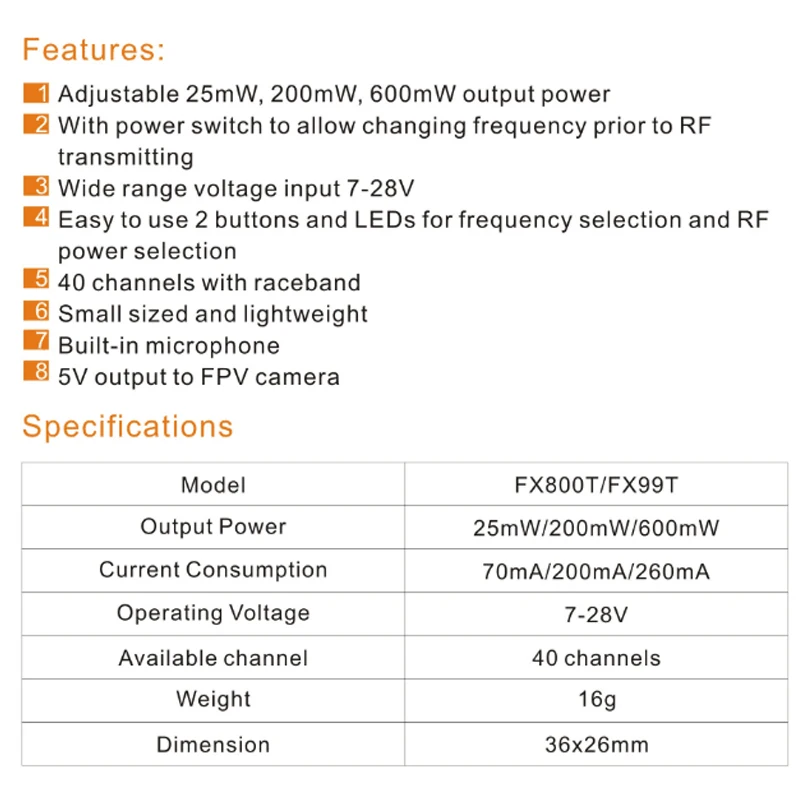 -Регулируемая выходная мощность 25 МВт 200 МВт 600 мВт -С выключателем питания, который позволяет менять частоту до передачи RF -Широкий диапазон входного напряжения 7-28 в -Простота в использовании, 2 кнопки и светодиоды для выбора частоты и выбора мощности RF -40 каналов с raceband -Компактный и легкий -Встроенный микрофон -Выход 5 В для камеры FPV Параметры: Бренд: FXT Модель изделия: FXT800-A Выходная мощность: 25 МВт, 200 МВт, 600 мВт Беспроводные каналы: 40 каналов Формат видео: NTSC/PAL Передающая Мощность: 25/200/600 мВт переключаемый Ток: 70 мА/200 мА/260 мА Рабочее напряжение: постоянный ток 7-28 в Выходное напряжение: 5 В Разъем порта: JST и штекер FUTABA Вес: 16 г Размер: 36x26mm С автоматической защитой от перегрева, для предотвращения повреждения модуля. Камера 1200TVL FPV: Размер: 22 мм x 22 мм Формат: PAL PAL: 1920H × 1080 в (1 МП) NTSC: 1020H × 1920V (1 МП) Горизонтальное разрешение: 1200TVL Видеовыход: 1,0vp p/75 Ом АРУ: 0,25/0,50/0,75/1,00 4 регулируемые уровни, до макс. 55dB WB: ВКЛ./ВЫКЛ. Тип Воздействия: электронное воздействие Электронный затвор: 1/50(1/60), 1/100000 секунды Гамма-коррекция: 0,45/1,0 Режим синхронизации: Синхронизация Объектив: 2,5 мм 130 градусов Рабочее напряжение: постоянный ток 5-12 В (Широкое напряжение, измеренное от 5 до 13 в) Рабочий ток: 70 мА (ow расход энергии) Работая Temp. : -20 градусов до 60 градусов Влажность: 0% ~ 98%