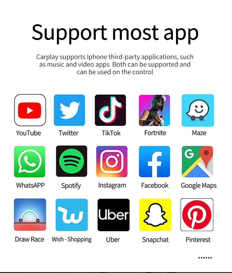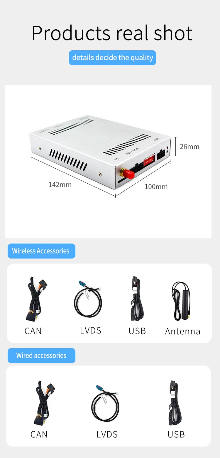 1. Работает с apple CarPlay, сопряжение через Bluetooth, передача через WIFI. 2. Работает с проводным CarPlay также, сначала выключите Wi-Fi, подключите через кабель освещения (проводное Удерживайте телефон одновременно) 3.Android Mirroring-Link для телефонов Android (ссылка для скачивания) 4.GPS навигационные приложения, Google Maps, Waze и Apple Maps доступны в режиме реального времени 5. Музыка яблоки Spotify,Apple Music, Amazon и т. Д. Аудио через фабрику Audi media, текст на дисплее для некоторых приложений. 6. Голосовое управление, говоря: "Эй, Сири... 7.Aftermarket фронтальный/задний/360 вход камеры. (Поддерживаются динамические Направляющие линии) 8.USB флэш-накопитель для воспроизведения музыки и видео с помощью подключения USB порта от CarPlay kit 9. Регулировка эквалайзера. Лучшее качество звука. Выберите свой любимый стиль свободно (поп, рок, мягкий, стандартный ..) 10. Полное управление кнопками OEM.