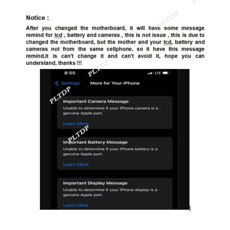 For iphone X / XR / XS / XS-Msx / 11 / 11 Pro / 11 Pro Max / 12 / 12Mini / 12Pro / 12Pro-Max / 13 / 13Mini / 13Pro /13Pro-Max / 14 / 14 Plus / 14 Pro / 14 Pro Max Motherboard with Face ID , when u installing, pls Do not touch camera lens,once touch it that will damage the Face ID function, thanks !!!