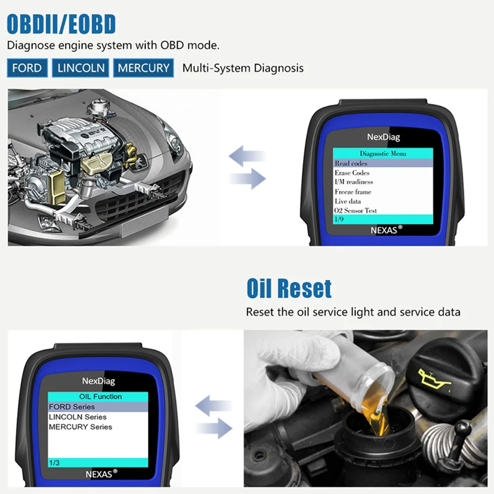 2. Краткий профиль: NexDiag ND603 для Ford / Lincoln / Mercury-профессиональный и мощный инструмент для диагностики неисправностей автомобилей, небольших гаражей ремонтный цех и механики, поставляя диагностику OE-level на всех электронных систем FORD. Он поддерживает почти все автомобили FORD с 1996 по 2018 год со стандартом OBD 16PIN DLC для дизельных и бензиновых двигателей. Диагностика двигателя, подушки безопасности, АБС, коробки передач и других ЭБУ. Также имеет специальные функции, такие как сброс давления на масляный светильник, регенерация DPF, запись батареи, электронная парковочная площадка EPB, сброс тормозов, сброс угла поворота руля и т. д. Кроме того, это также правильный инструмент, работающий с OBD/EOBD диагностикой для двигателей всех автомобилей, внедорожников, мини-фургонов после 1996 года.