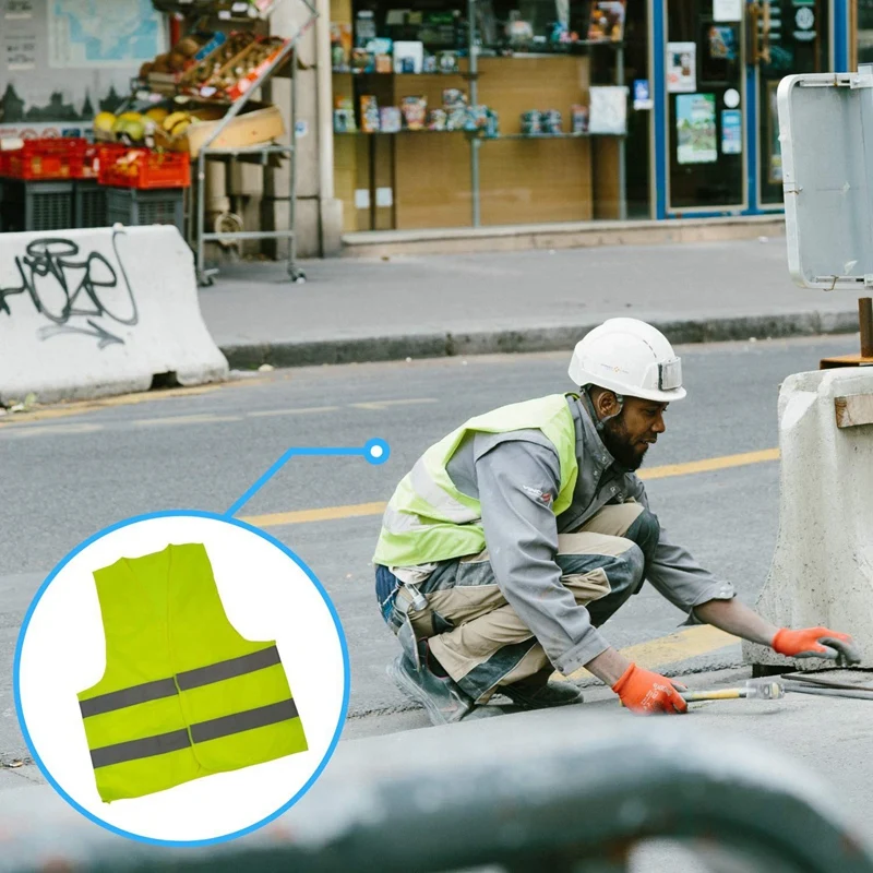 Безопасность во-первых: флуоресцентные зеленые защитные жилеты с двумя 2-дюймовыми серебристыми светоотражающими полосками, которые обертывают 360 ° вокруг туловища.