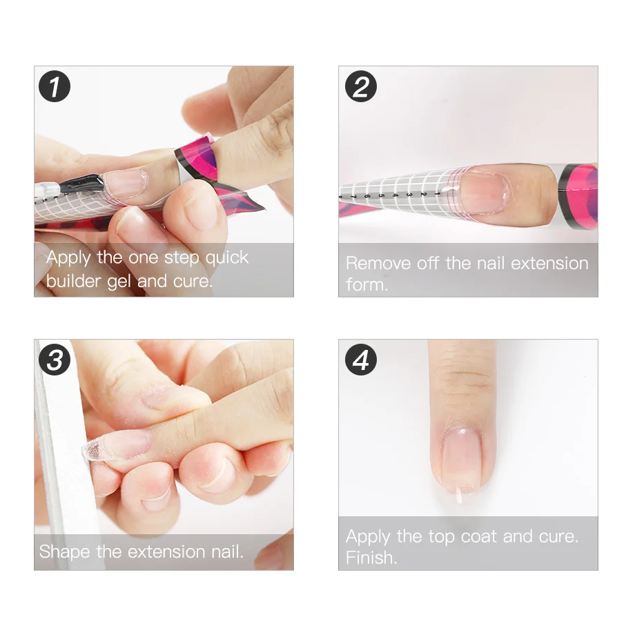 1. Форма и файл ногтя, удалить кутикулу. 2. Нанесите форму ногтя на ноготь. 3. Нанесите один шаг строительного геля на кончик ногтя, вылечите его под светодиодный лампой для 30 s или УФ-лампой для 120 s. 4. Нанесите один шаг геля на весь ноготь и продлите его до нужного положения, затем вылечите его под светодиодный лампой около 30 s или УФ-лампой для 120 s. 5. Снимите форму, форма и файл расширенного ногтя. 6. Очистите поверхность ногтей. 7. Нанесите верхнее покрытие и вылечите под светодиодный светильник на 30 s или УФ-лампу на 120 s. Отделки.