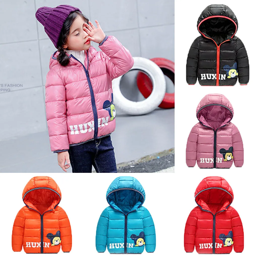 Детская зимняя куртка для маленьких мальчиков и девочек, теплая плотная одежда с капюшоном и мультипликационным принтом животных