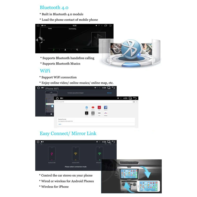 Передача данных по Bluetooth. Wi-Fi: беспроводной доступ в Интернет и функция совместного использования точки доступа. Формат фильма: Поддержка всех Видео Android, воспроизведение потокового мультимедиа и 1080P видео декодер, таких как MPEG-1/2/4, H264, RMVB, DivX и т. Д. Формат музыки: поддержка MP3, WMA, WAV, AC3, OGG, FLAC и т. д. и воспроизведение сетевого аудио. Формат изображения: Поддержка JPEG, BMP, PNG, TIFF и т. д. формат документа: PDF, Word, Excel; Поддержка всех приложений Android.