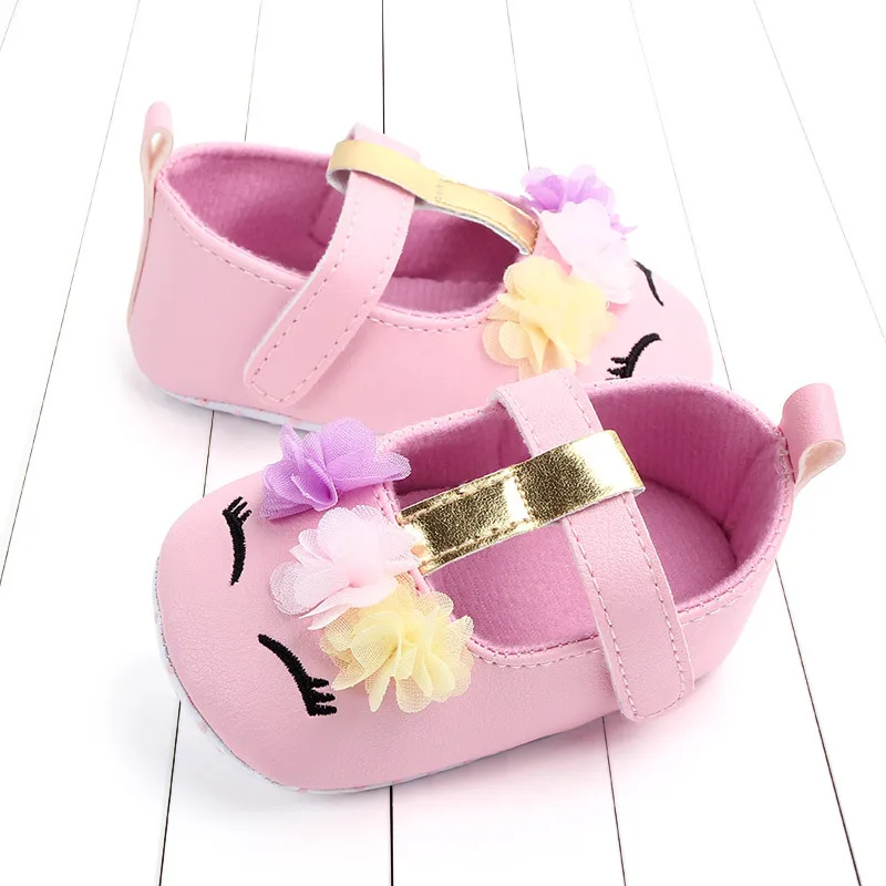 Мягкая обувь из ПУ кожи для новорожденных девочек с цветочным принтом и единорогом; Обувь для кроватки на подошве; Сезон весна-осень; Предходовая обувь для детей 0-18 месяцев