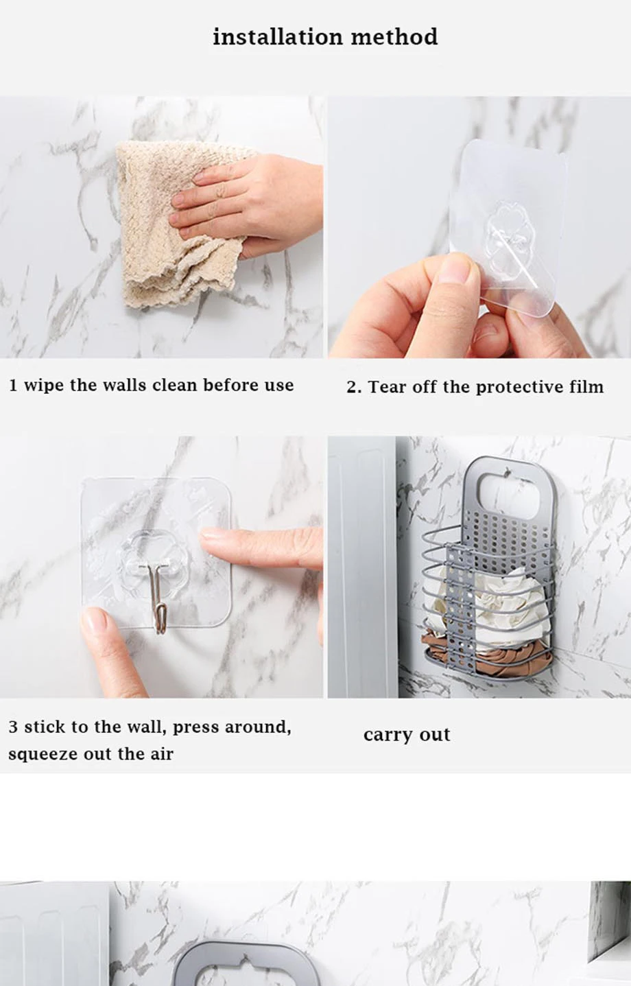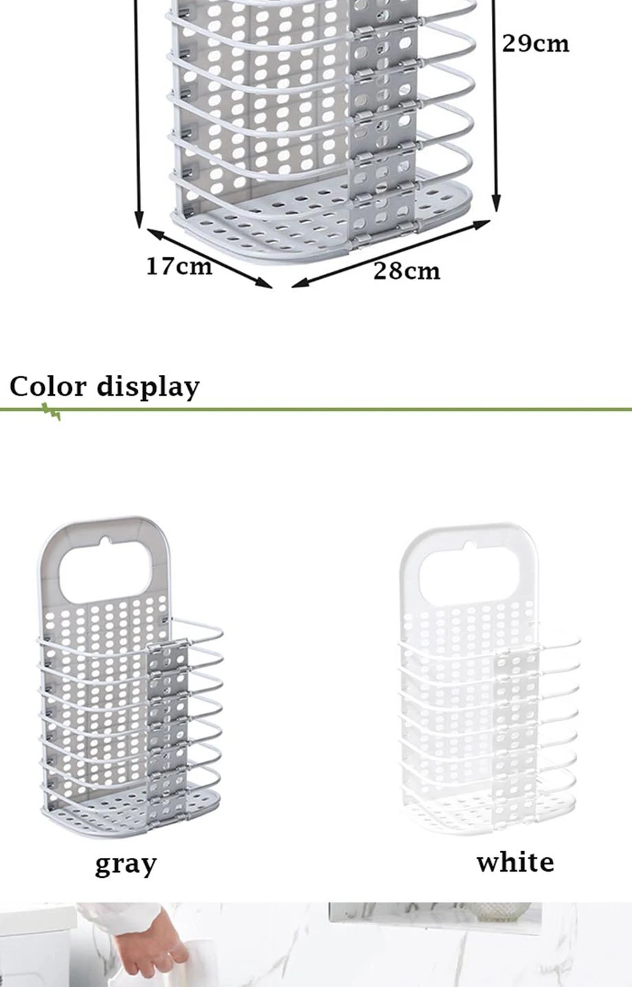 Особенности 1. Изготовлен из толстого нового материала PP, он анти-давления и анти-старения. 2. Не маркировочный крюк имеет сильный подшипник. 3. Складная конструкция позволяет легко хранить, когда не используется, не занимает места. 4. Он с ручкой, поэтому он прост в использовании. 5. Форма проста. Его можно использовать в качестве корзины для грязной одежды, и он используется для отделки других повседневных вещей. Описание Название: настенная складная корзина для грязной одежды Материал: новый полипропилен Размер: 18,50*6,69 * 11.02in Список 1 * корзина для грязной одежды