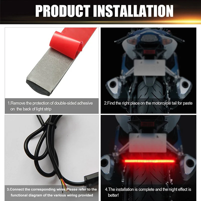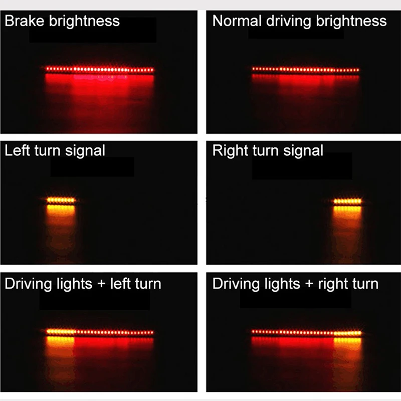 1. Универсальный гибкий 33 светодиодный светильник для мотоцикла/задний стоп-светильник/Сигнальный светильник/светильник номерного знака. 2. Место установки: Автомобильный стоп-сигнал для мотоцикла, стоп-сигнал поворота, светильник s, тормозной светильник s, светильник номерного знака, ходовой светильник 3. Водонепроницаемый, с прочным ПВХ резиновым покрытием, который может быть использован в дождливый день. 4. Отличный продукт, чтобы добавить тормозной светильник, ходовой светильник и поворотники. 5. С двухсторонней клейкой лентой, легко устанавливается. 6. Поезд Низкий красный, тормоза ярко-красный, и сигнал поворота мигает желтый. 7. Количество лампочек: 33 (количество левых и правых шариков указателя поворота 12SMD, светильник для вождения/тормозной светильник, шарик 21SMD)