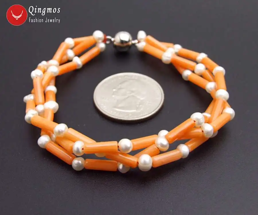 Модные 3*9 мм оранжевый толстый срез коралловый браслет для женщин с 4 мм круглый белый жемчуг 3 пряди браслет ювелирные изделия колье 7,5 ''bra490