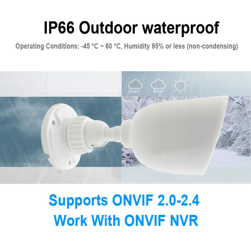 Поддержка уличная водонепроницаемая Поддержка ONVIF, может работать с сторонней NVR поддержкой POE Разрешение: 1080P(1920*1080) Поддержка мобильного видеонаблюдения (iOS,android) Поддержка обнаружения движения и оповещения по электронной почте Поддержка ночного видения С IR-CUT, поддержка дневной/Ночной переключатель 24 шт. ИК-светодиодов, 15-30 м ИК-расстояние для ночного видения Многоэкранное программное обеспечение и CMS Обработка изображений: Автоматическая экспозиция (AE), автоматический баланс белого (AWB), автоматический контроль усиления (AGC) Поддержка обнаружения движения Встроенный микрофон Дополнительный POE Комплектация: 1 * ip камера 1 * CD-плеер