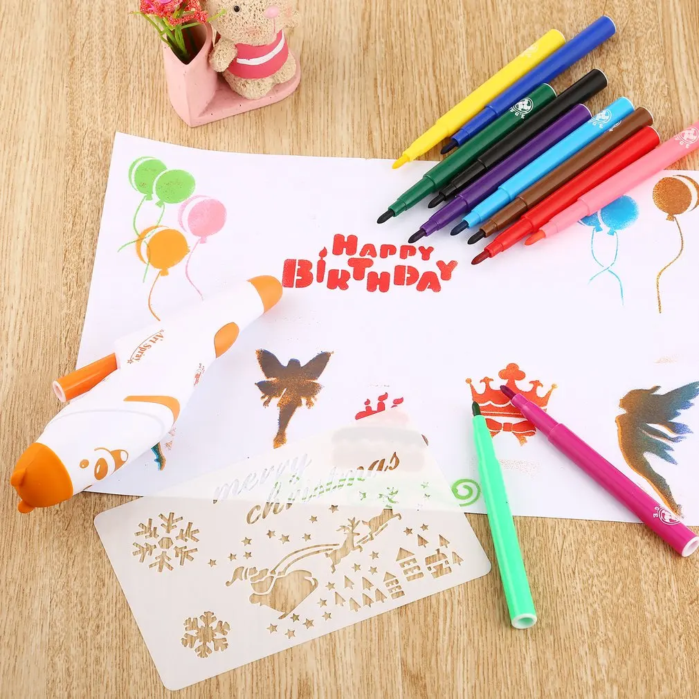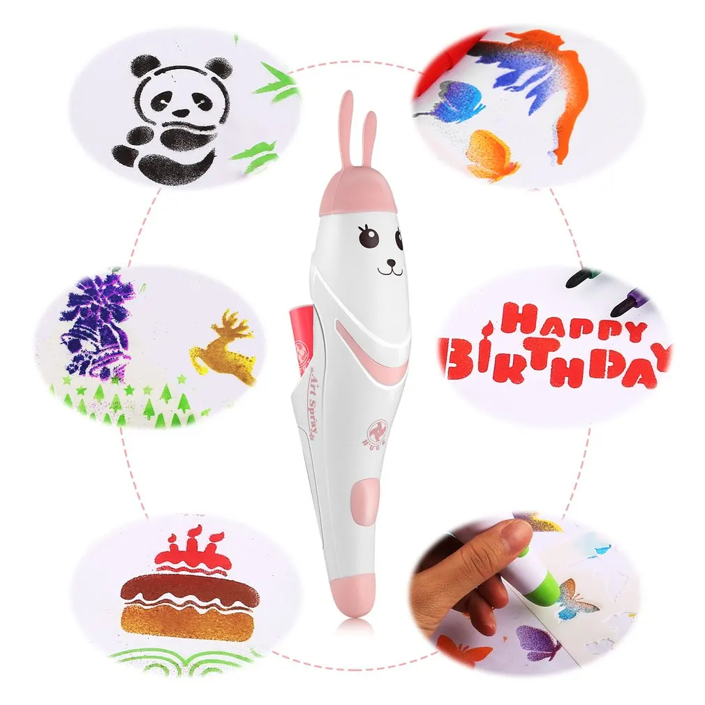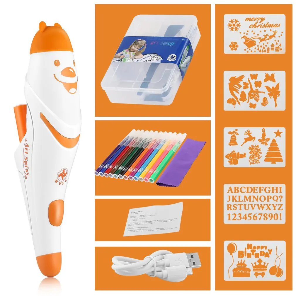 The Spray Art Set inspires young imaginations to create works of spray art using markers as the ink. Designed for kids ages 6+, the set features new and improved spray. It includes 12 changing markers and an electric-powered airbrush Pen to spray the marker ink. And includes 5 stencil sheets so kids can spray precise lines and detailed designs.