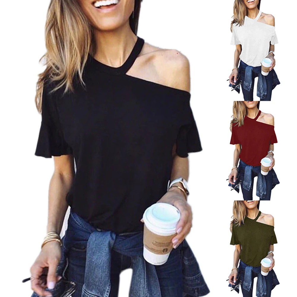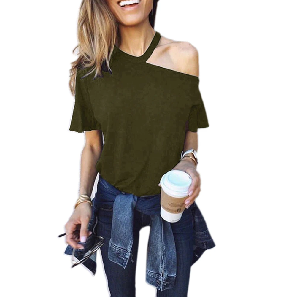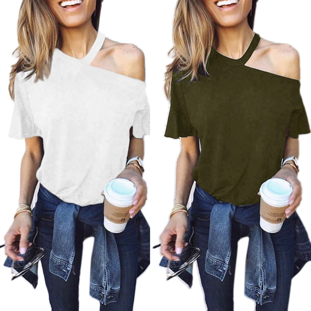 Повседневная Женская Однотонная футболка с открытыми плечами, свободный летний топ с коротким рукавом