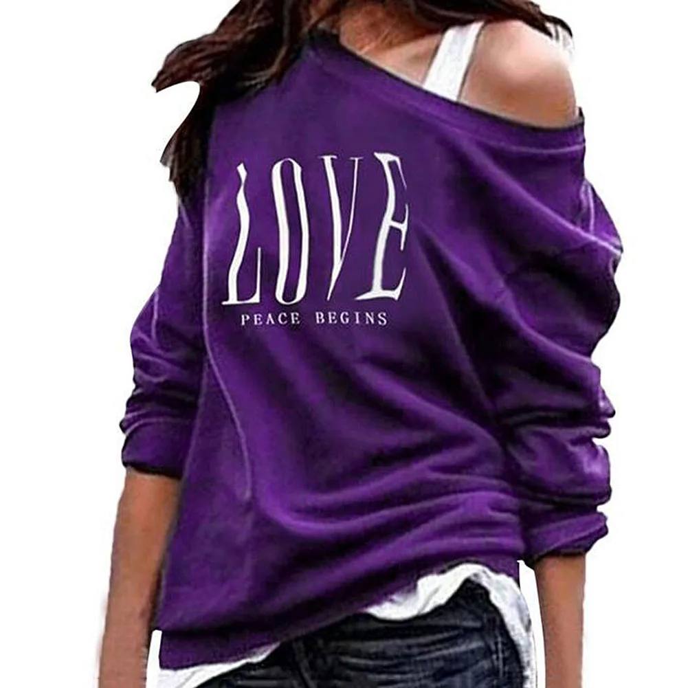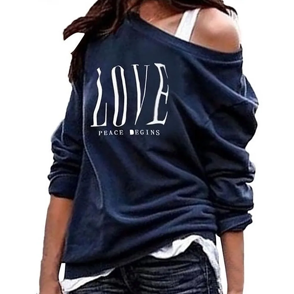 Женская сексуальная Толстовка на одно плечо с надписью Love, пуловер с длинными рукавами
