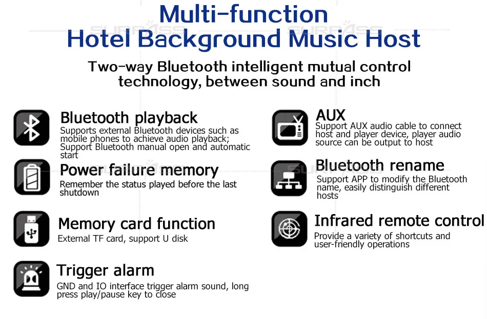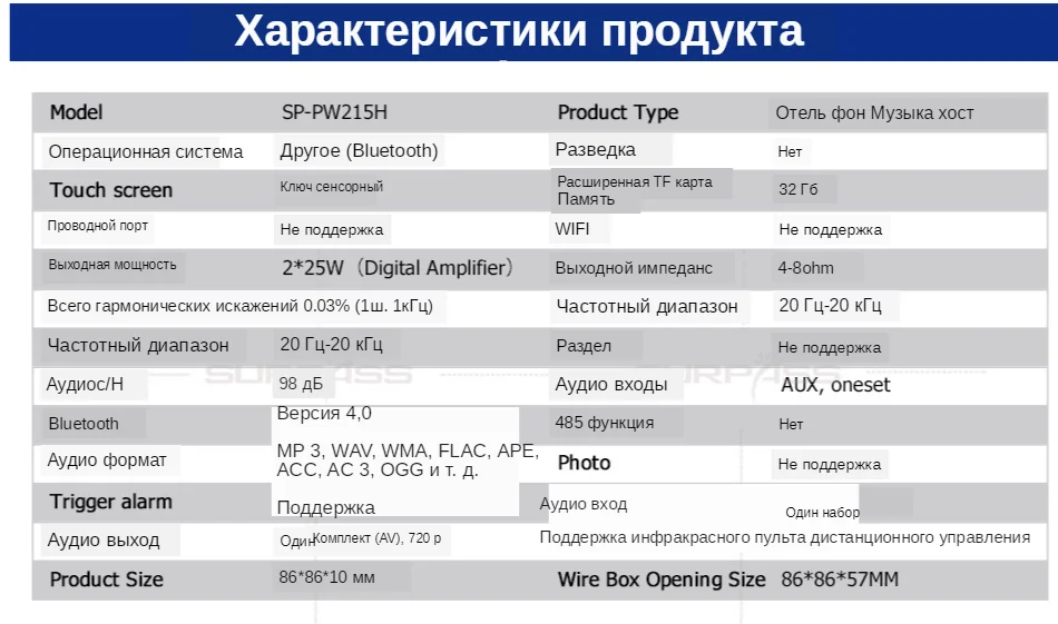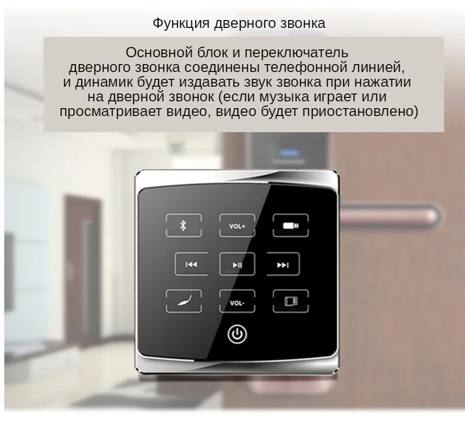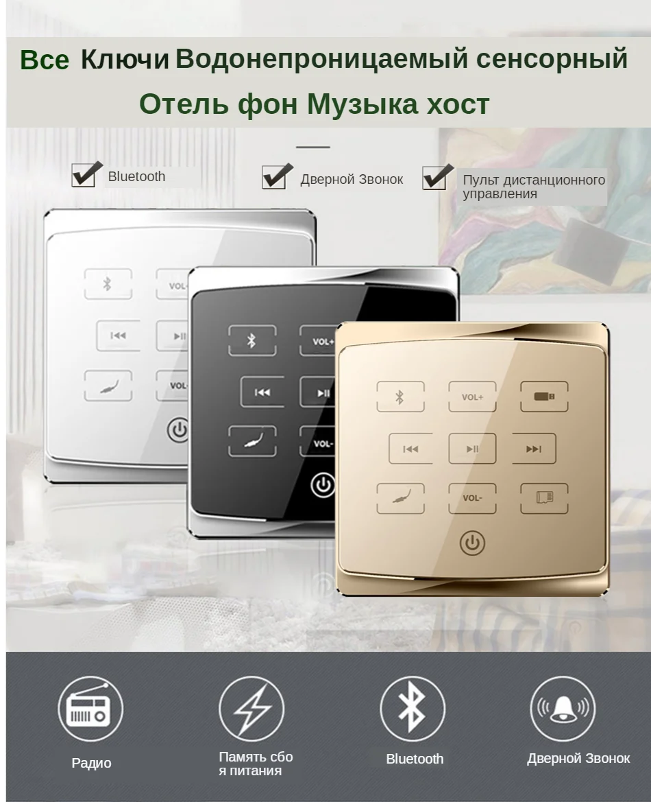 ● Сенсорный ключ ● Режим питания: AC 110-250VC ● Выходная мощность: 2*25 Вт (цифровой усилитель мощности) ● Аудио входы один комплект; выход один комплект ● 485: выход один комплект ● Bluetooth: поддержка ● Установка: 86 стандартная проволочная коробка, передняя стена Описание функции фонового хоста отеля: 1. Стекло для обработки 2.5D с пескоструйной рамой из алюминиевого сплава. 2. Загрузка и воспроизведение указанной музыки. 3. Поддержка автоматического воспроизведения песен на питание. 4. Функция отключения памяти: запоминание состояния воспроизведения до последнего отключения. 5. Функция звукового эффекта: Поддержка обычных, рок, классических, джаз, поп и других звуковых эффектов. 6. Поддержка функции пускового звонка. 7. Поддержка триггера связи воспроизведения музыки. 8. Поддержка отключения триггера связи.