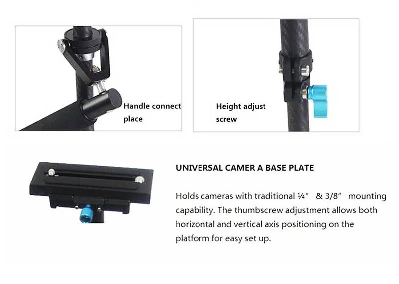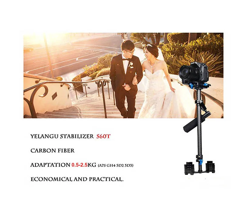YELANGU S60T Профессиональный портативный карбоновый стабилизатор 60 см для камеры DSLR Видеокамера Steadicam лучше, чем S60 Внимание: 1. Камера, показанная на картинке, не входит в комплект. 2. Только в том случае, Совместимость со всеми DSLR и видеокамер до 5.5 фунтов/2,5 кг. 3. Есть CD-диск в деталях продукта, пожалуйста, загрузите и настройте баланс таким образом. Особенности: 1. Может быть ручной или использоваться вместе с жилетом и амортизацией 2. Высококачественное углеродное волокно, соединение оснащено шариковым подшипником, гибким, анти-столкновения 3. Регулируемая длина, удобная для ношения и использования; Подходит для камеры в пределах 5.51lb/2,5 кг 4. Тонкое мастерство, большая амортизация; Тонкая Регулировка дизайна, удобно регулировать баланс 5. Уникальные 2 соединительные руки и одна амортизирующая рукоятка, увеличивает рабочее пространство и удобен в использовании Параметры: Бренд: YELANGU Материал: углеродное волокно Вес: 1800 г Максимальная нагрузка: 5.51lb/2,5 кг Максимальная высота: 24,02 дюйма/61 см Минимальная высота: 15,16 дюйма/38,5 см Модель: S60T Совместим с: DSLR и видеокамерами Упаковочный лист: 1 х стабилизатор Чехол для переноски (1 шт.);