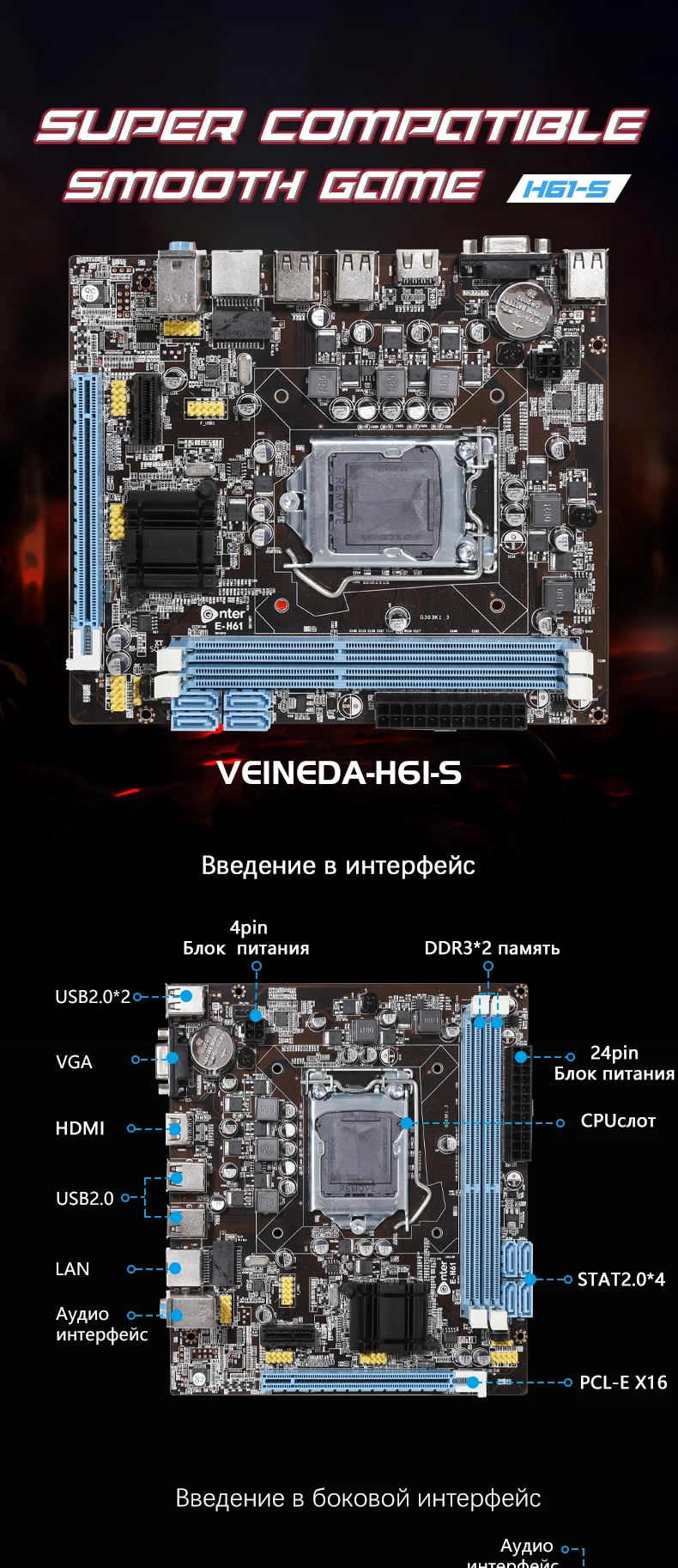 Параметры: Название продукта: материнская плата для компьютера (VEINEDA, H61-S) Основной набор микросхем: для Intel H61 Тип слота для процессора: разъем LGA 1155 Поддержка процессора: поддерживает полный спектр процессоров Intel 1155 Corei7 / i5 / i3 / Pentiun / Celeron Тип памяти: DDR3 Описание памяти: двухканальная память DDR3 1066/1333/1600 Поддержка максимальной емкости памяти: до 16 Гб Размер: около 19x17 см Расширенный Интерфейс: Интерфейс USB: USB2.0 * 6 Разъем для видеокарты: PCI-E X16 Разъем для PCI-Ex1: разъем 1xPCI-Ex1 Внешний порт: Аудиоразъемы, VGA, HDMI, сетевая карта, USB Интерфейс SATA: 2,0 4 x SATAII Разъем памяти: 2 × DDR3 DIMM Мощность разъем: 1*4 Pin, 1 * 24-контактный Мощность разъем Форм-фактора: Micro ATX Посылка включает в себя: Материнская плата для компьютера, 1 шт.Материнская плата протестирована перед отправкой?
