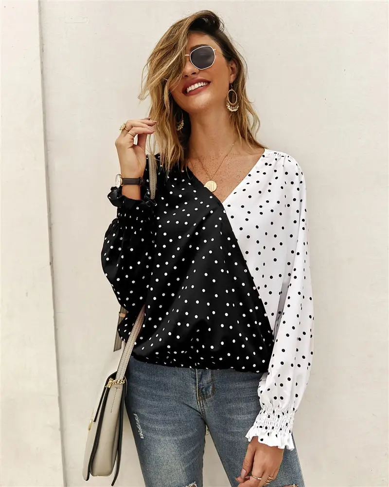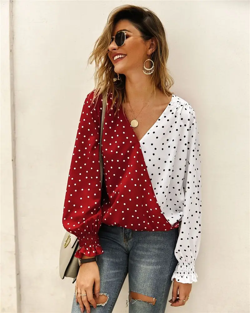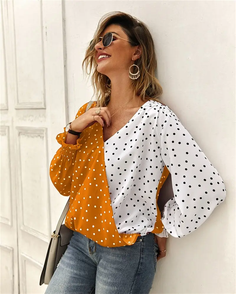 Женская сексуальная однотонная Лоскутная футболка в горошек с v-образным вырезом, осенняя Повседневная винтажная уличная футболка, женские топы